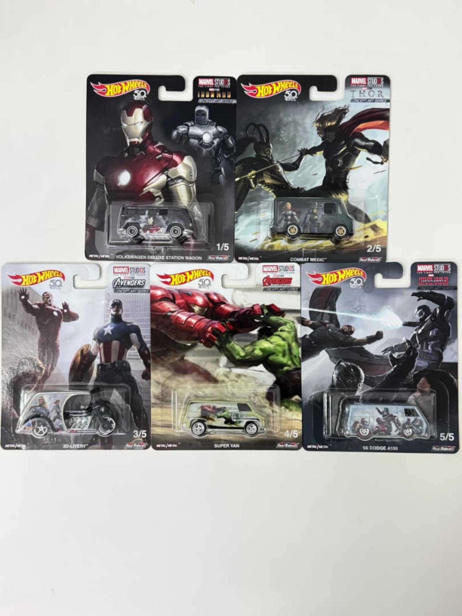 This is a collectible set of 5 Hot Wheels cars, each themed around Marvel Studios characters and movies. The set includes Volkswagen Deluxe Station Wagon, Combat Medic, 30-Livery, Super Van, and '66 Dodge A100. Each car is in its original sealed packaging, showcasing iconic Marvel heroes like Iron Man, Captain America, Hulk, and others. A perfect addition for Marvel fans and Hot Wheels collectors alike.