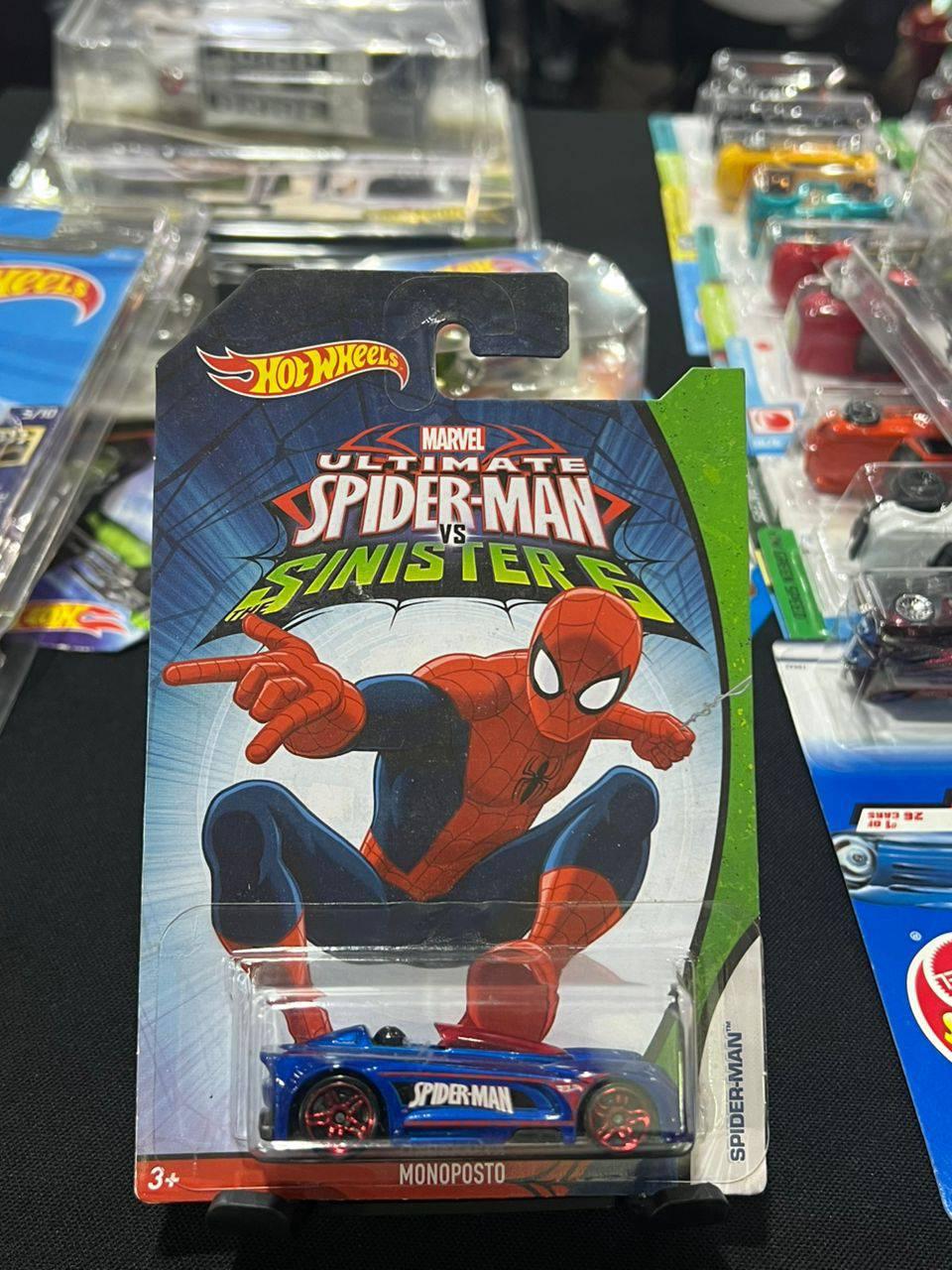 This Hot Wheels collectible features the Monoposto car from the Marvel Ultimate Spider-Man vs Sinister 6 series. The car is primarily blue with red accents and Spider-Man branding on the side. It comes sealed in its original packaging, which features vibrant Spider-Man artwork.