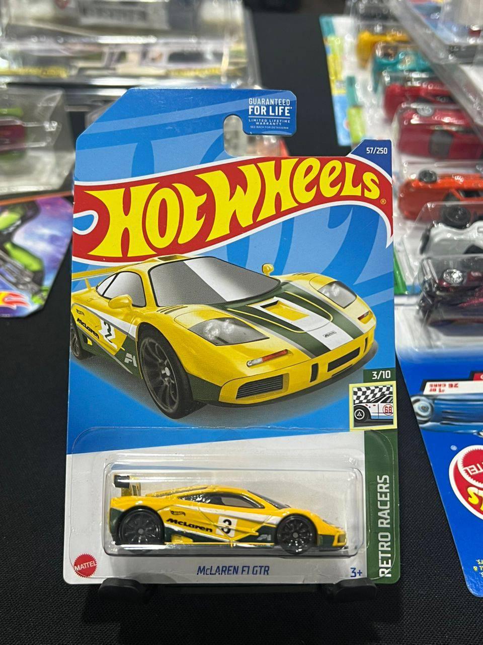 This is a Hot Wheels McLaren F1 GTR from the Retro Racers series, numbered 57 out of 250. The car features a yellow body with racing stripes and detailed decals, packaged in its original blister card. Perfect for collectors and Hot Wheels enthusiasts.