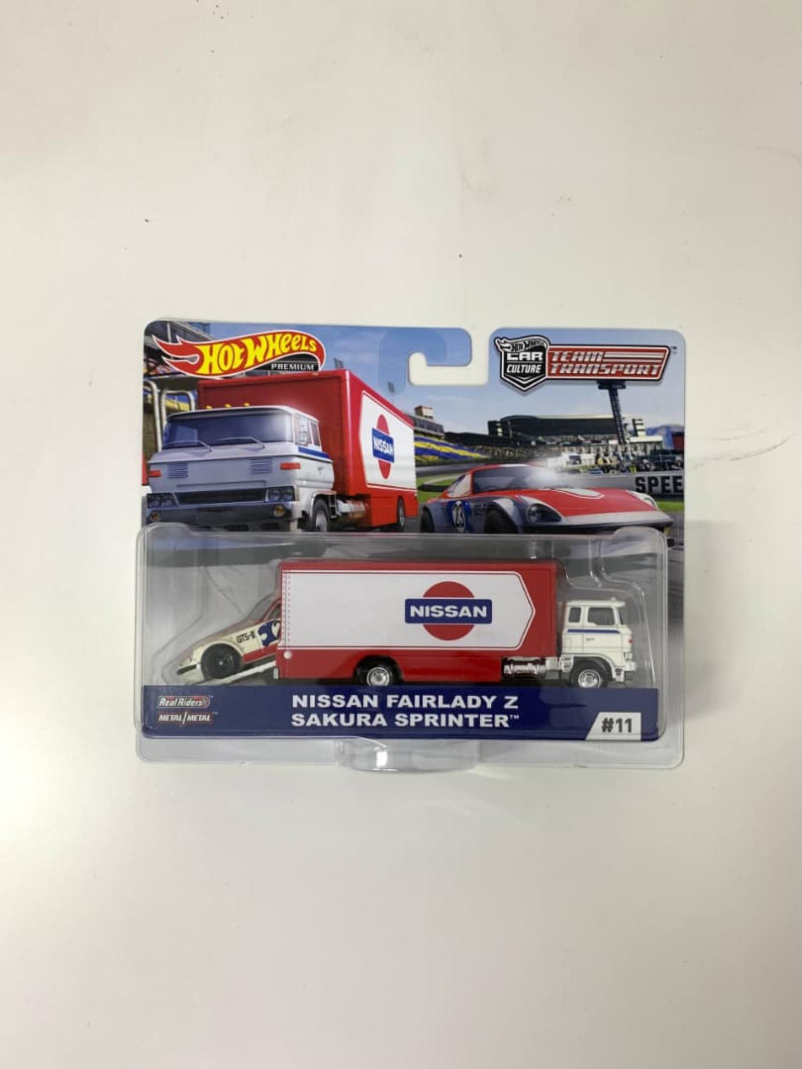 Hot Wheels Premium Car Culture Team Transport featuring the Nissan Fairlady Z and Sakura Sprinter truck. Item is in original sealed packaging with vibrant colors and detailed design. Ideal for collectors and fans of Nissan and Hot Wheels.