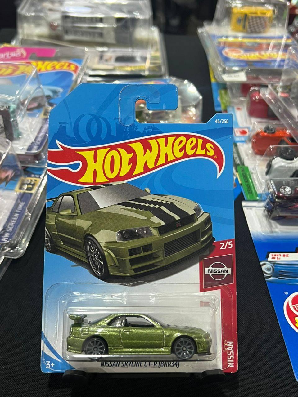 This Hot Wheels collectible toy car features the iconic Nissan Skyline GT-R (BNR34) in a metallic green finish. Part of the 2023 lineup, it is number 45 out of 250 in the series and 2 out of 5 in the Nissan collection. The car is packaged on its original Hot Wheels card with vibrant artwork. Ideal for collectors and enthusiasts of classic Japanese sports cars and Hot Wheels fans.