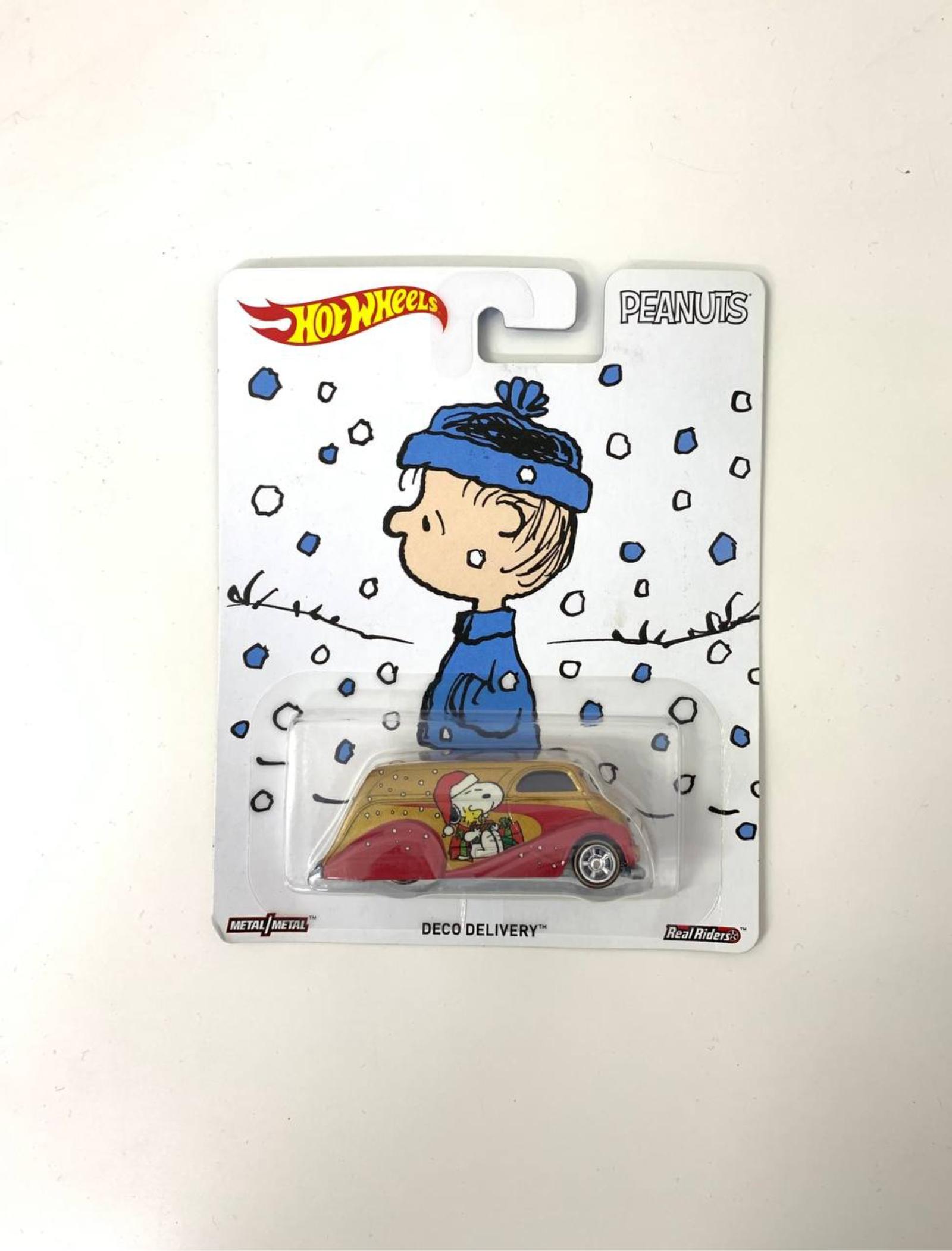 This Hot Wheels collectible features a Deco Delivery diecast car decorated with Snoopy and holiday-themed graphics from the popular Peanuts series. The car is encased in its original blister packaging, which showcases artwork of Linus in a winter scene. Part of the Real Riders series with metal-on-metal construction, this limited edition Hot Wheels is perfect for collectors of Peanuts memorabilia and diecast cars.