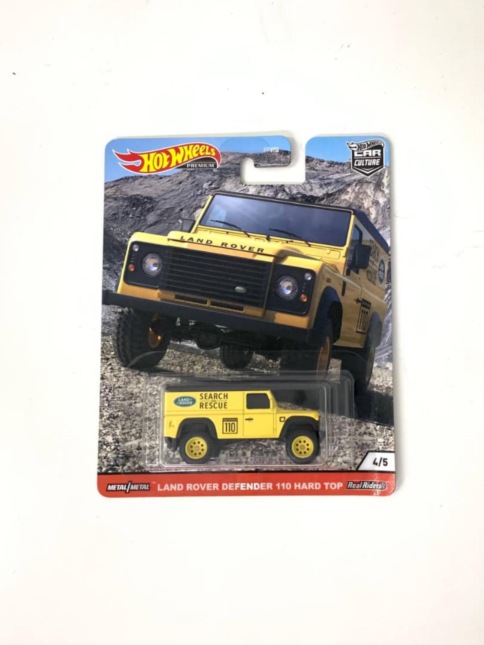 Hot Wheels Premium collectible featuring a detailed Land Rover Defender 110 Hard Top in yellow Search & Rescue livery. Part of the Car Culture series (4/5) with real rider tires and metal construction. The packaging is unopened and in excellent condition, perfect for collectors.