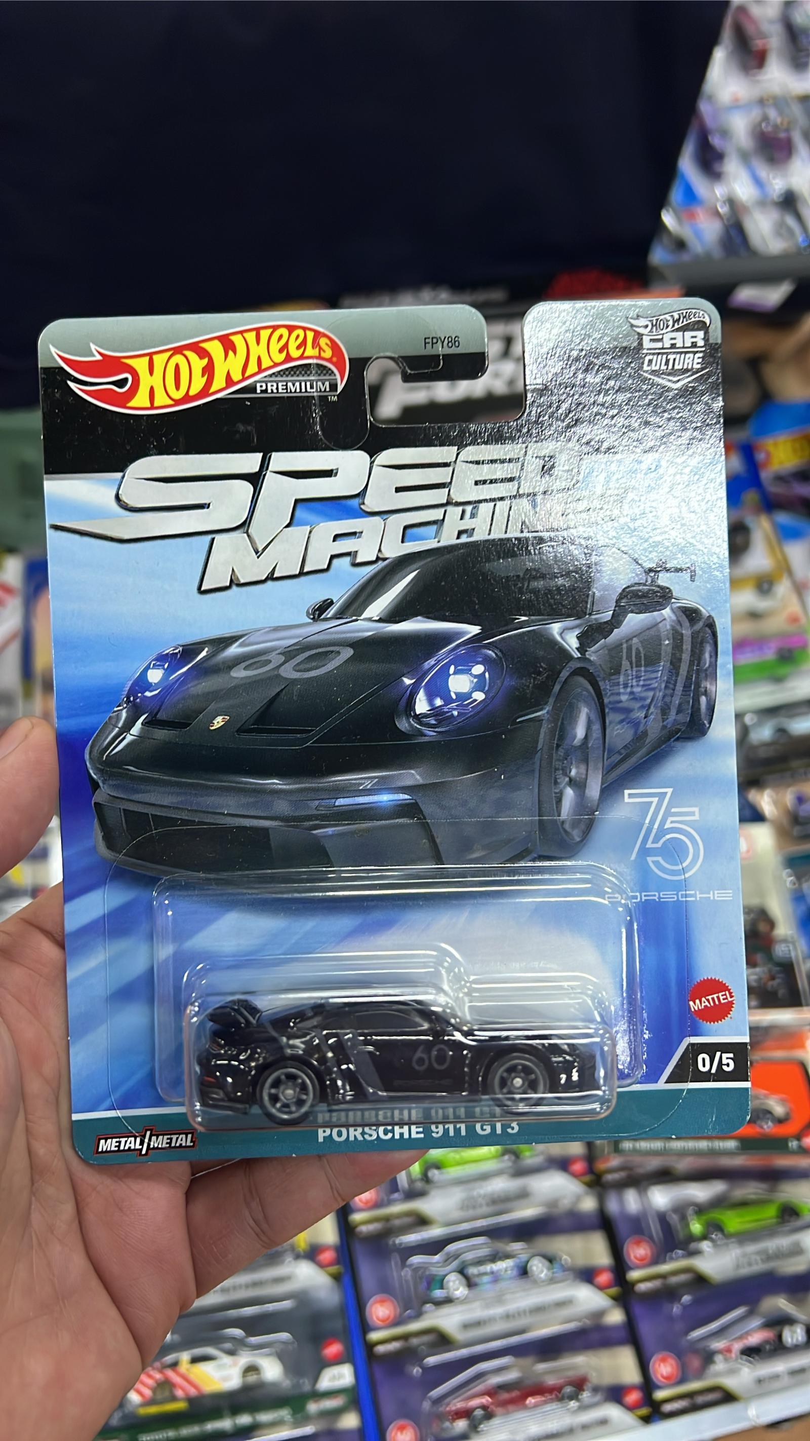 This Hot Wheels Premium Speed Machines collectible features the Porsche 911 GT3, part of the 75th Porsche anniversary series. The die-cast car is metal on metal construction and is model 0/5 in the set. The packaging shows minor wear but remains intact, perfect for collectors.