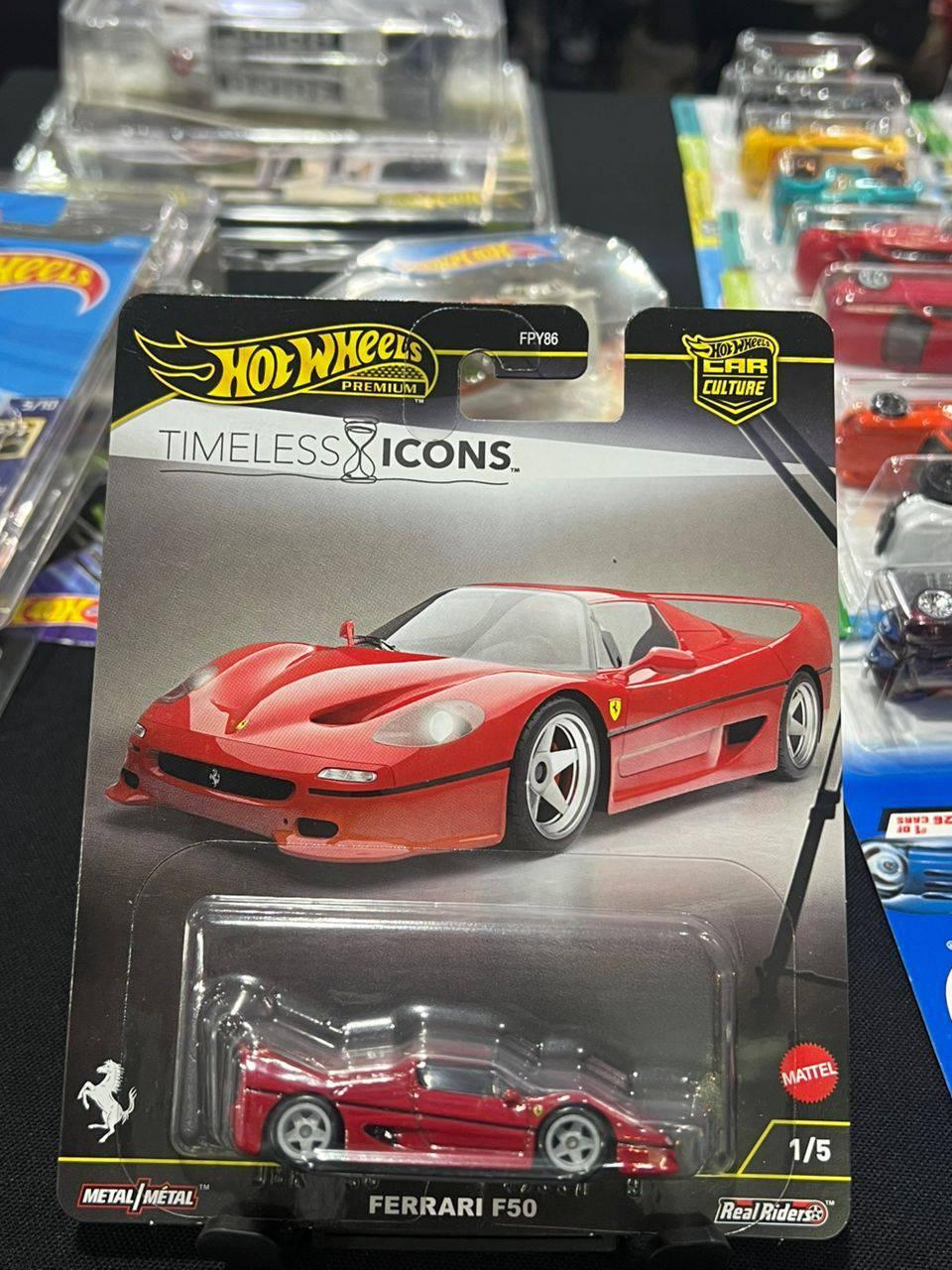 Hot Wheels Premium Timeless Icons Ferrari F50 die-cast model from the Car Culture series. Features metal body and base with Real Rider rubber tires. This collectible represents the iconic Ferrari F50 in striking red, part of a 1/5 set.