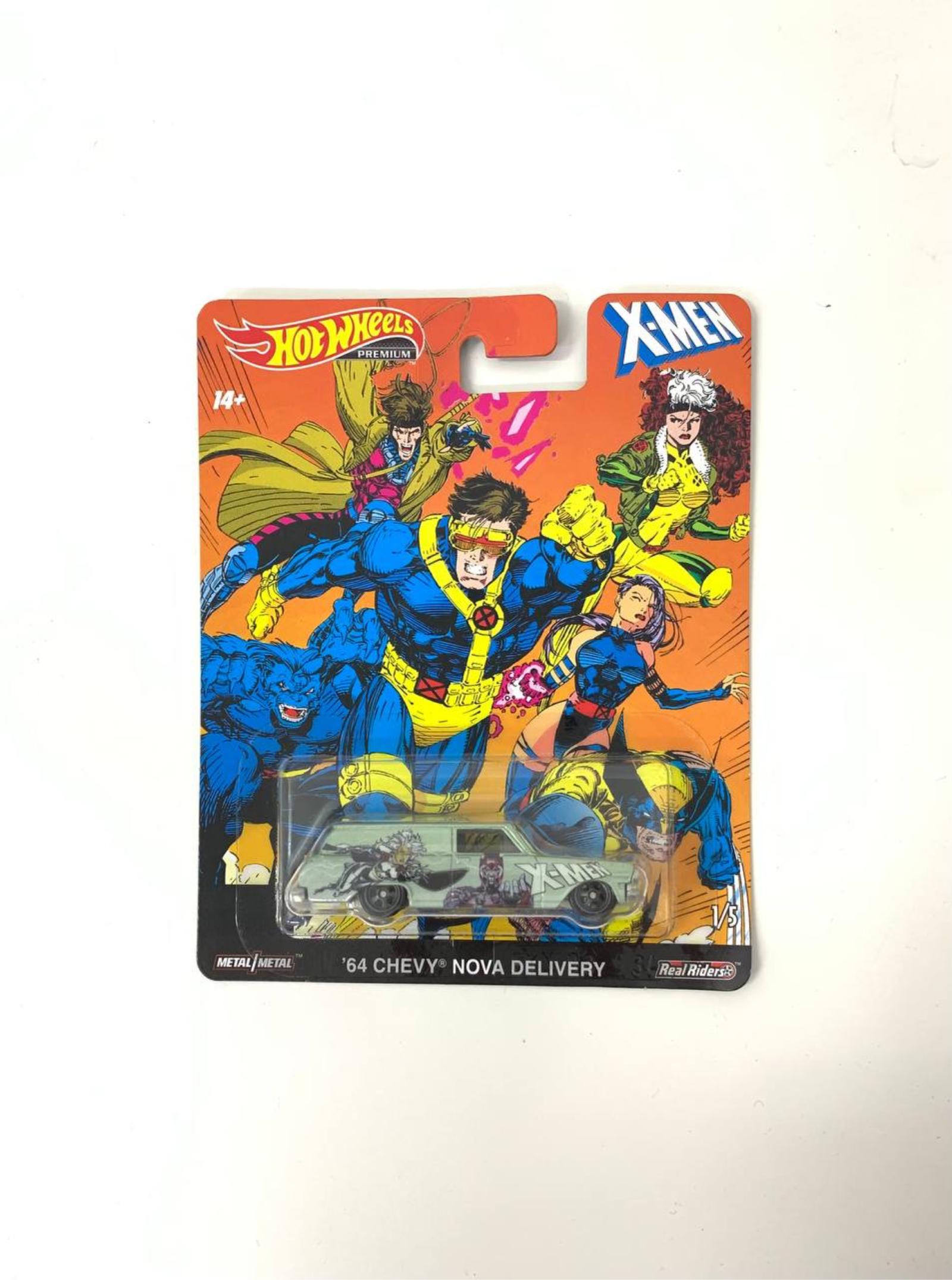 Hot Wheels Premium collectible featuring the X-Men themed '64 Chevy Nova Delivery. This limited edition model showcases vibrant artwork of X-Men characters on both the packaging and the die-cast car. Part of a 5-piece series with Real Riders wheels, crafted with metal components. Suitable for ages 14 and up. Perfect for collectors who appreciate Marvel and classic cars.