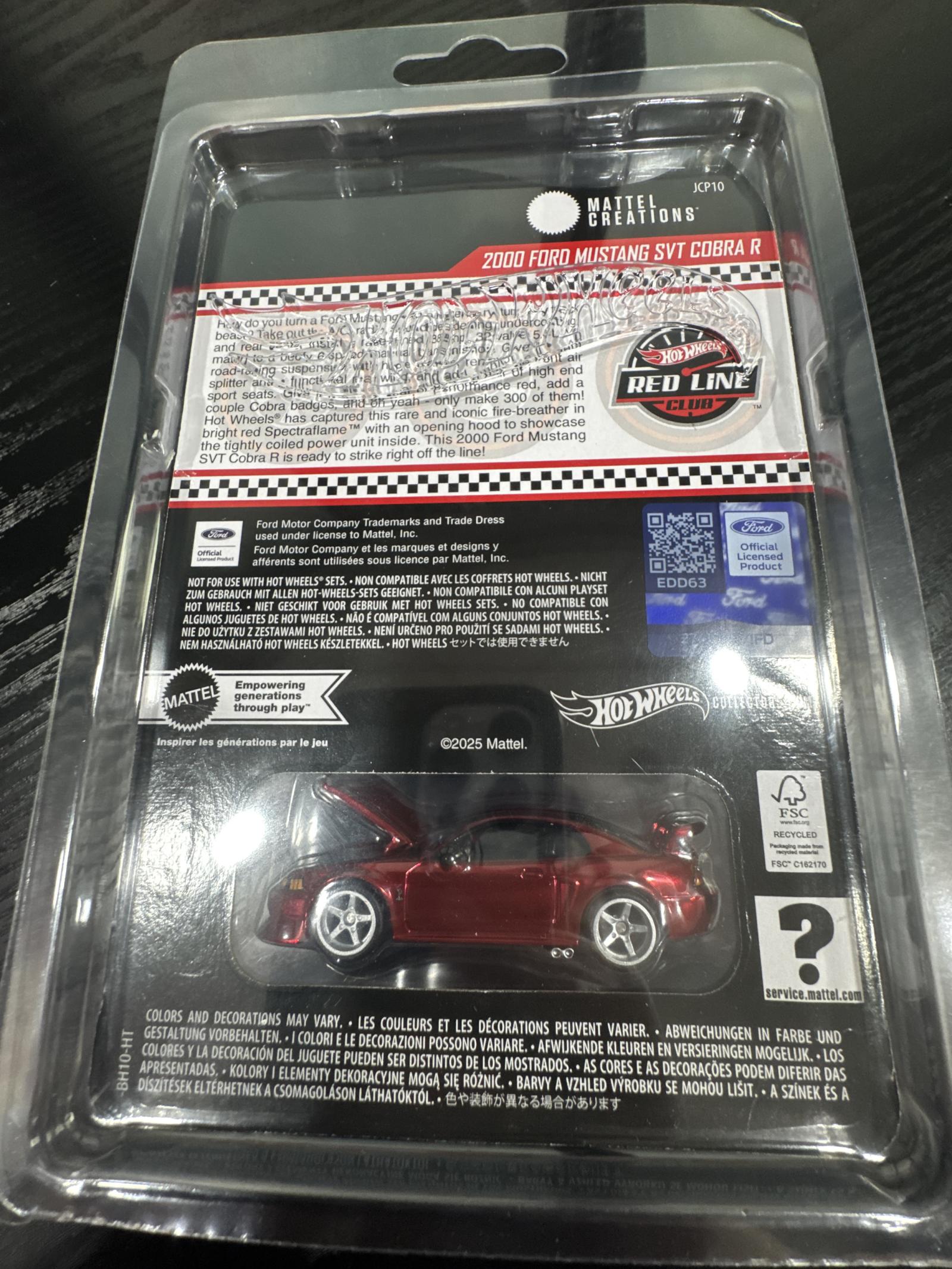 This collectible Hot Wheels Red Line Club edition features a 2000 Ford Mustang SVT Cobra R in metallic red finish. The model includes detailed features such as an opening hood showcasing the power unit inside, sporty rear spoiler, and realistic wheels. The diecast car is new and still sealed in its original packaging, making it ideal for collectors.
