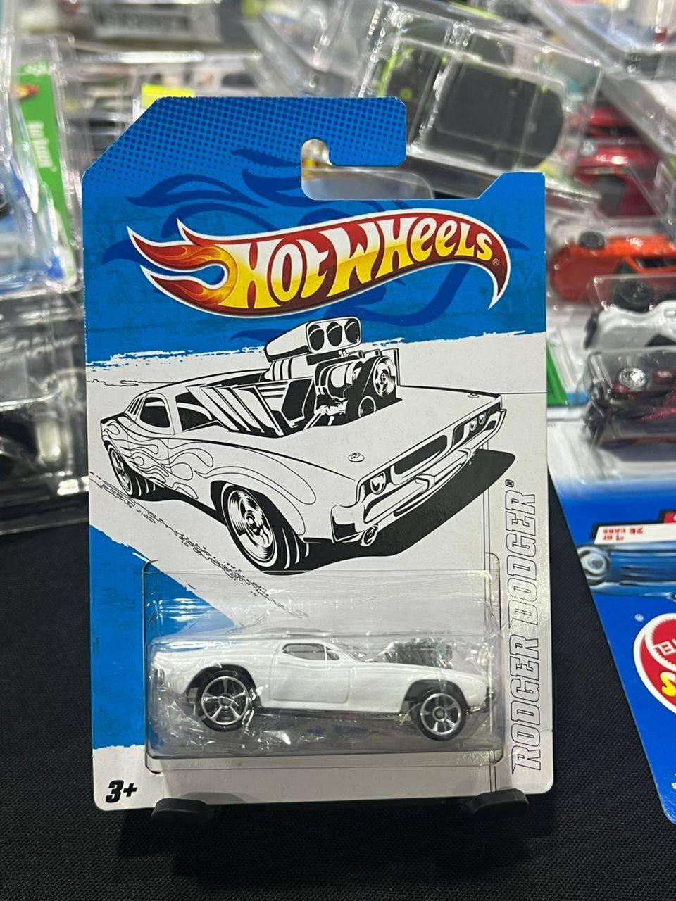 Hot Wheels Rodger Dodger die-cast car in white, packaged on original card. A classic collectible piece suitable for ages 3 and up. Packaging shows slight wear at the top but remains intact, car appears unused and well-preserved.