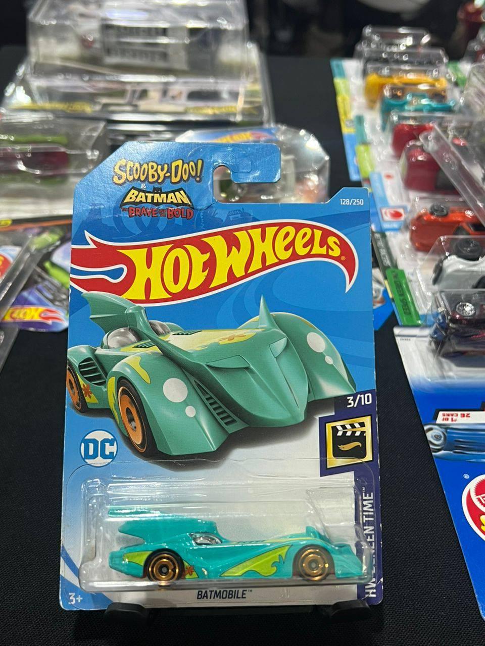 Hot Wheels Batmobile from the Scooby-Doo & Batman Brave and Bold series. Part of the HW Screen Time collection, this model is number 128/250 and 3/10 in the series. The car features teal and green colors with orange wheels, packaged in original sealed blister card packaging.