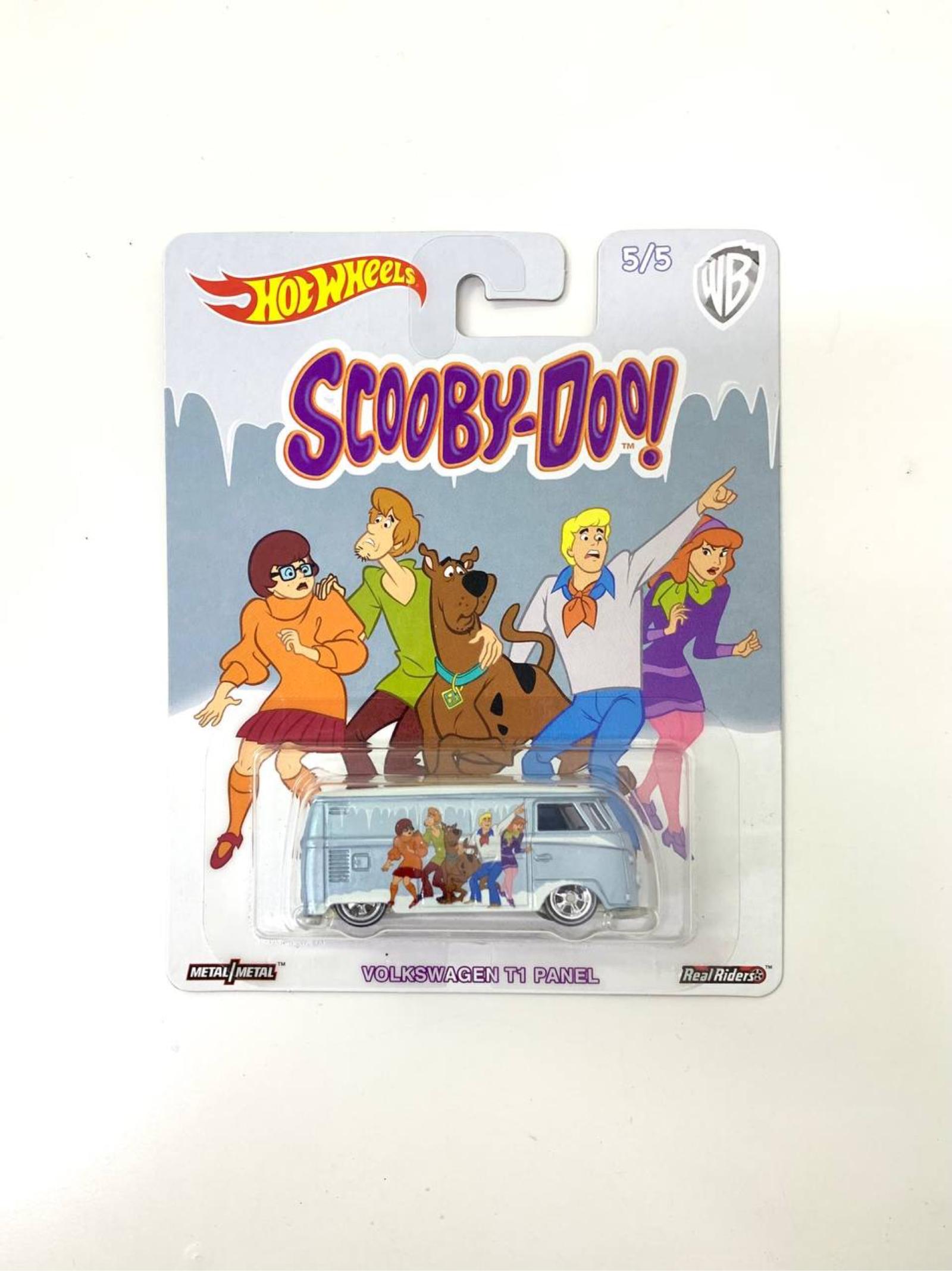 Hot Wheels Volkswagen T1 Panel featuring Scooby-Doo characters printed on the side. Part of the Scooby-Doo series, this collectible car is made of metal with Real Riders wheels. Packaging includes classic Scooby-Doo artwork with all main characters. A great addition for Hot Wheels and Scooby-Doo fans.