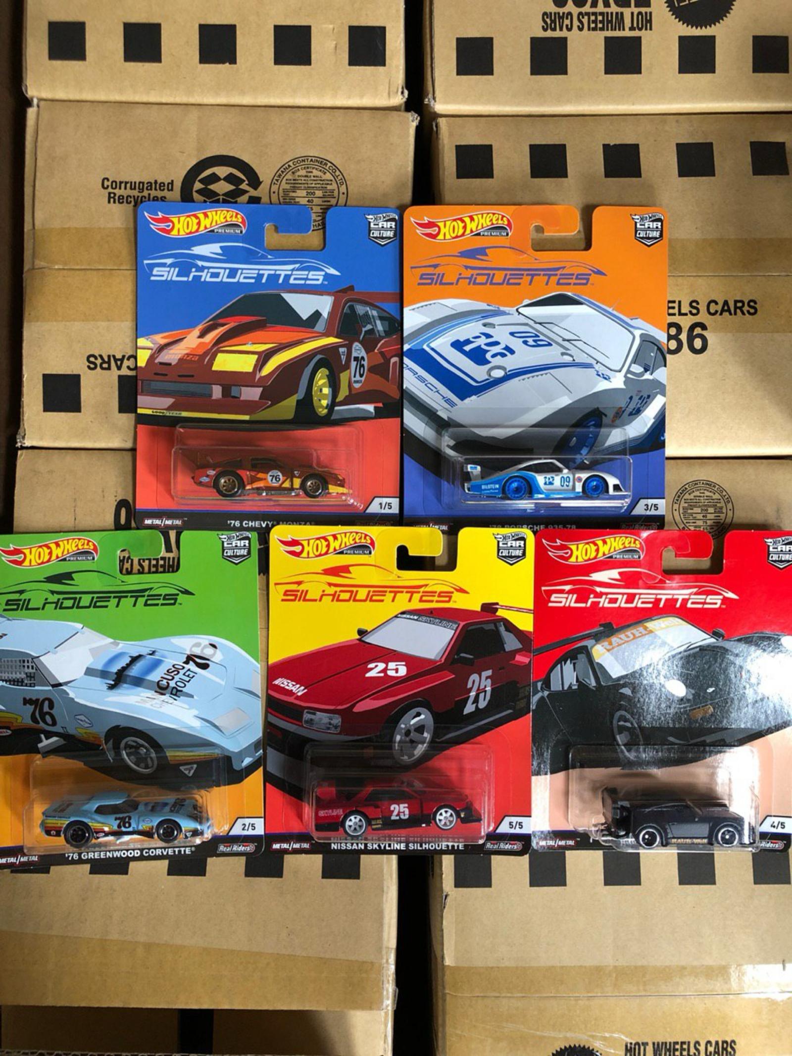 Complete set of 5 Hot Wheels Silhouettes die-cast cars in original packaging. Includes '76 Chevy Monza (#4/5), Porsche 917 LH (#3/5), '76 Greenwood Corvette (#2/5), Nissan Skyline Silhouette (#5/5), and one additional silhouette model (#1/5). Each car features detailed designs and is part of the Hot Wheels Car Culture series with Real Riders tires. Perfect for collectors seeking a full Silhouettes series in sealed condition.