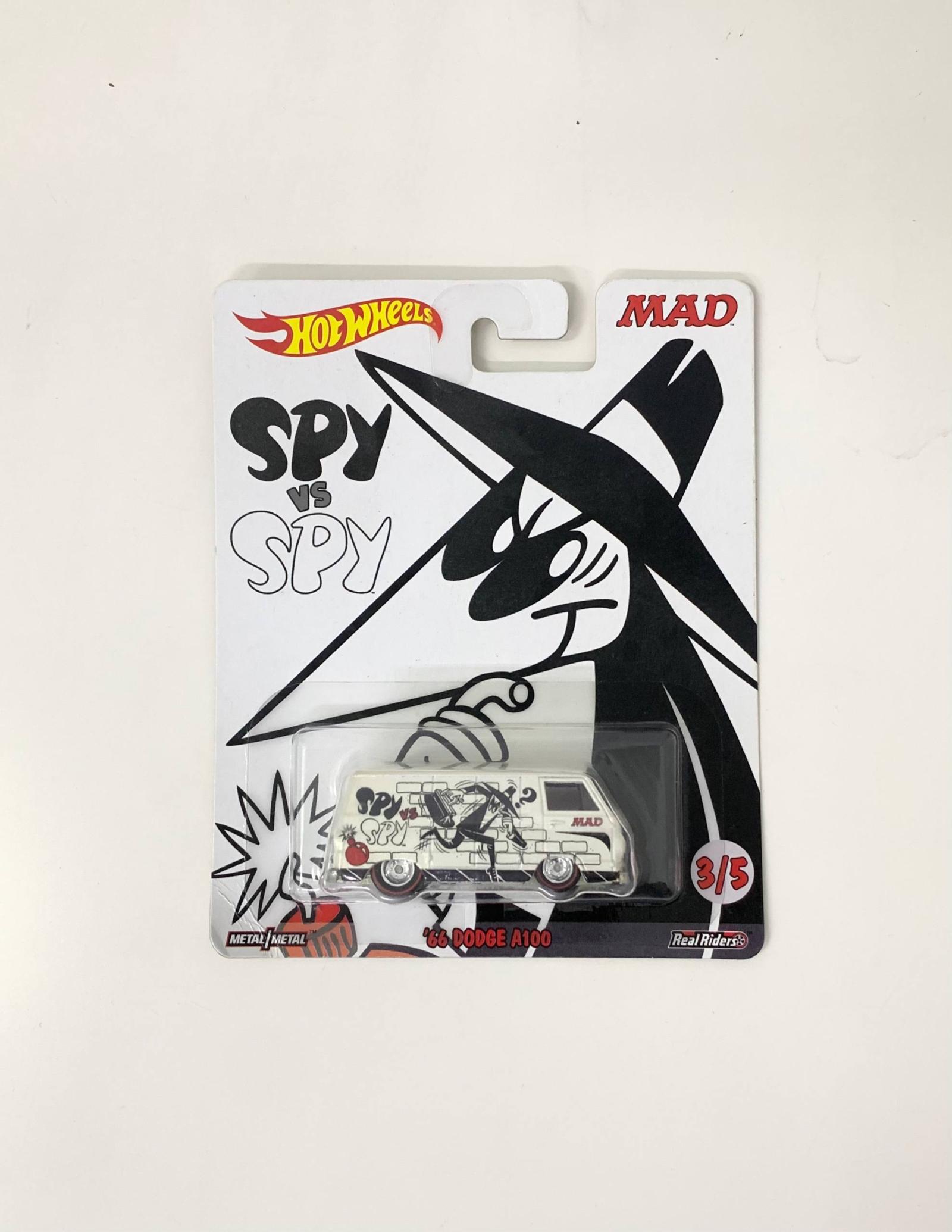 Hot Wheels collectible '66 Dodge A100 van featuring a Spy vs Spy design from MAD magazine. This van is part of a limited series (3/5) and includes Real Riders wheels. The toy is sealed in original packaging with vibrant graphics and metal body.