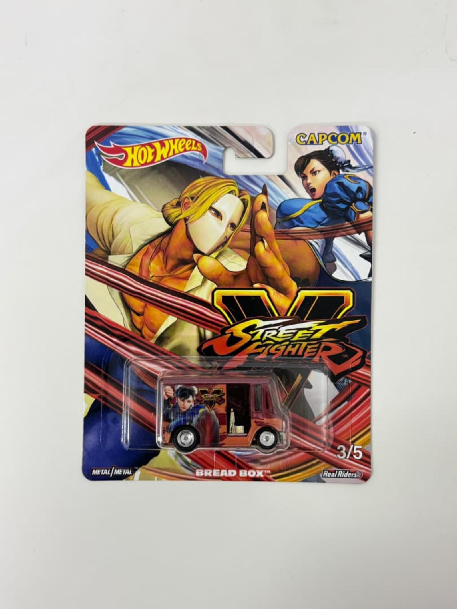 Hot Wheels collectible featuring the Street Fighter V themed Bread Box truck. Part of a limited series (3/5) with detailed Street Fighter graphics on the truck. Comes in original unopened packaging with vibrant artwork showcasing characters from the game. Made with metal and equipped with Real Riders tires for added authenticity.