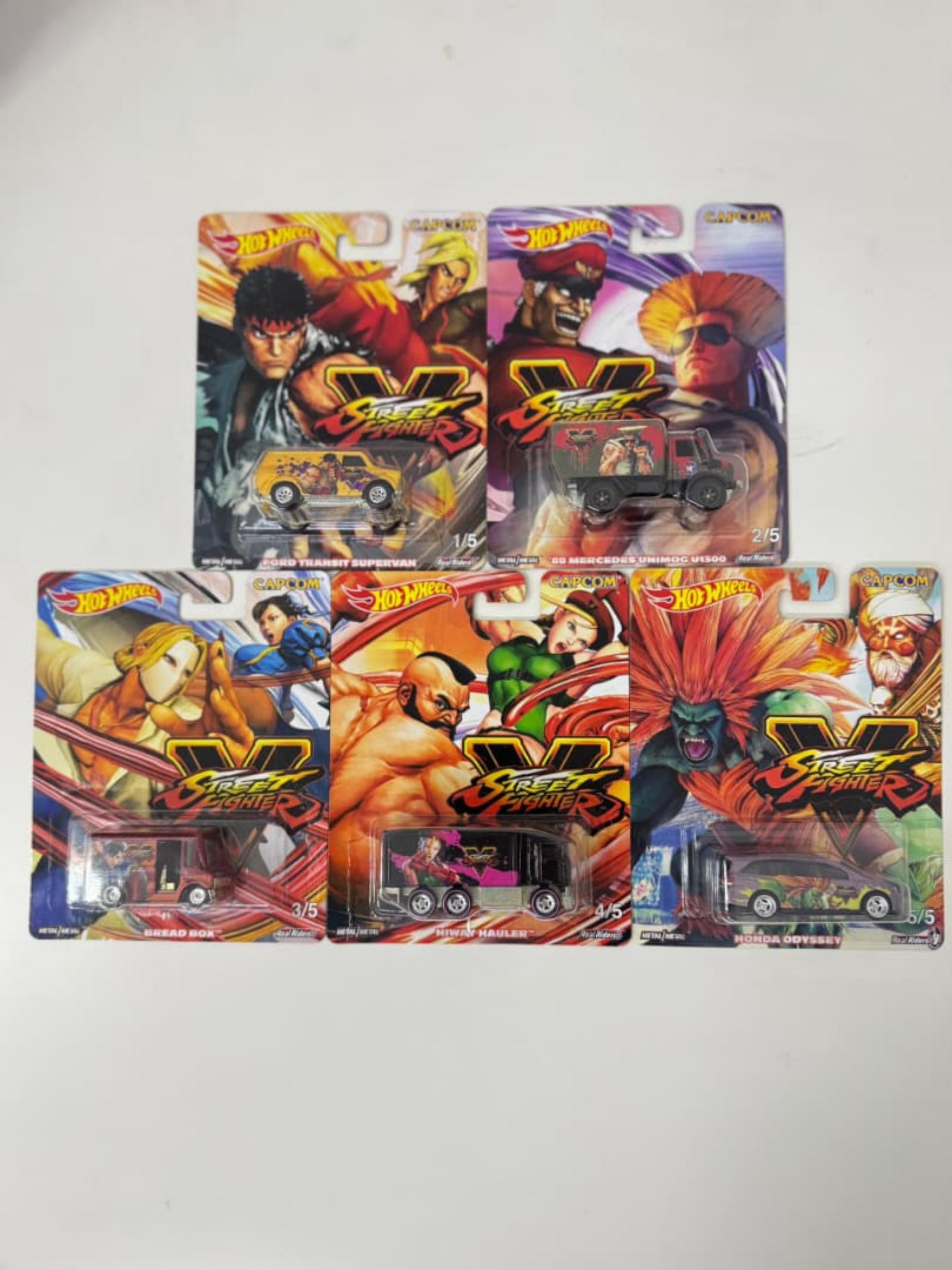 This is a complete 5-pack set of Hot Wheels collectible vehicles themed around Capcom's Street Fighter V characters. The set includes the Ford Transit Supervan, '88 Mercedes Unimog US500, Bread Box, Hiwan Hauler, and Honda Odyssey, each featuring unique character designs and artwork on the cars and packaging. These vehicles are part of a limited series numbered 1/5 through 5/5. Perfect for collectors of Hot Wheels or Street Fighter memorabilia.