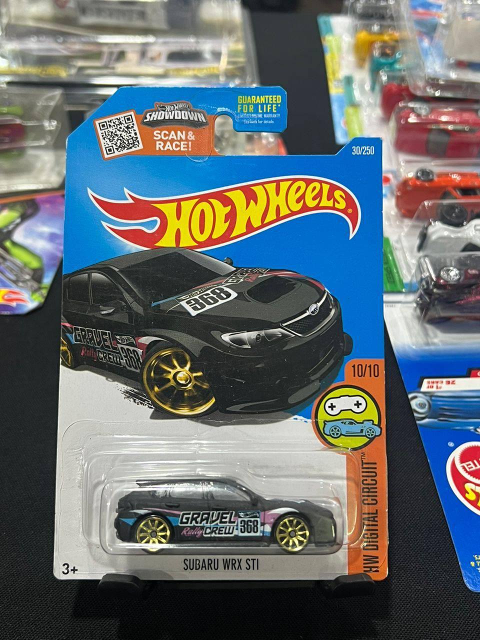 Hot Wheels Subaru WRX STI die-cast car from the HW Digital Circuit series. Features a black body with Gravel Rally Crew 368 graphics and gold wheels. This is car number 30 out of 250 in the series and 10/10 in its subset.