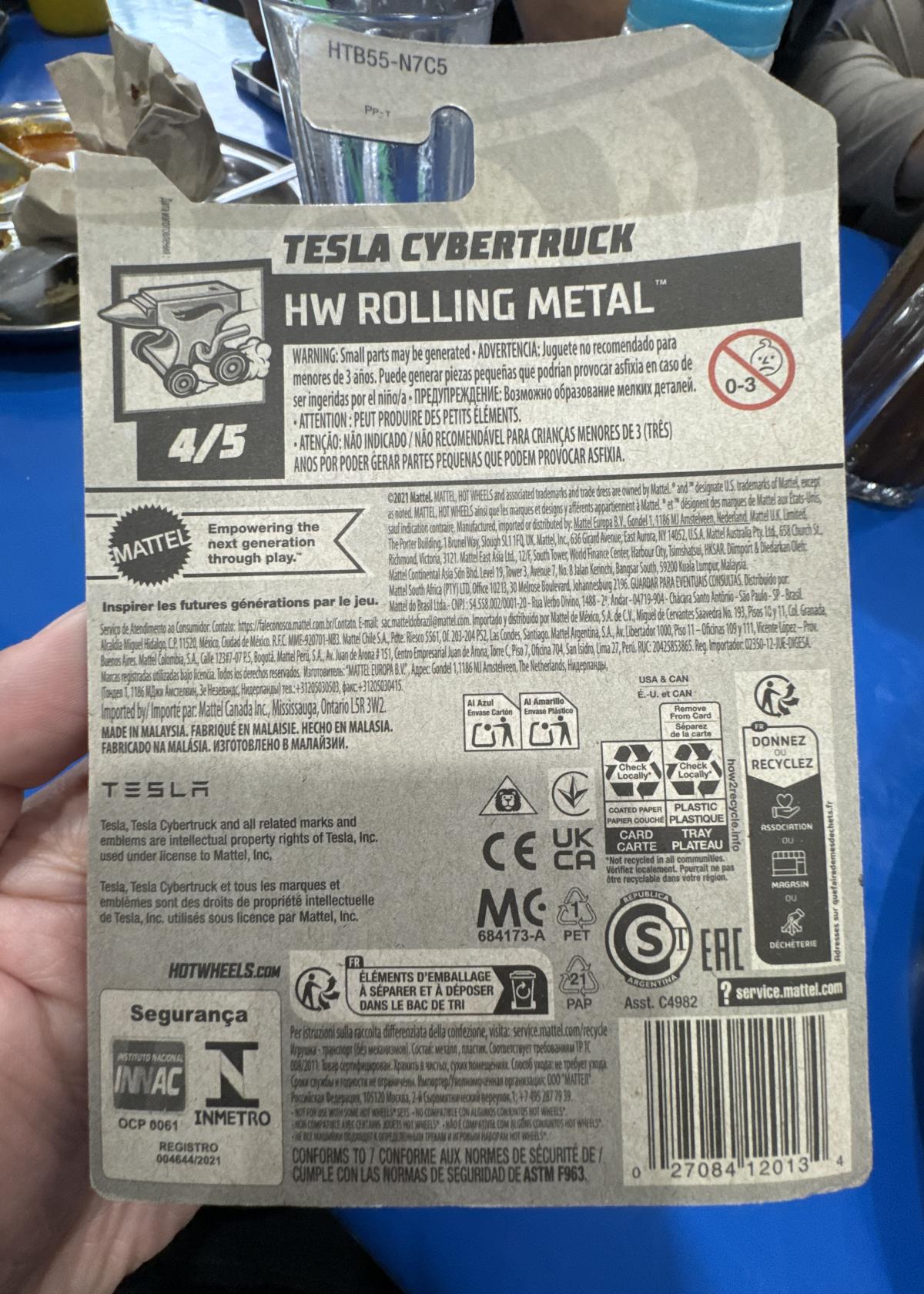 This Hot Wheels die-cast model features the futuristic Tesla Cybertruck from the 2021 HW Rolling Metal series. Numbered 246 out of a limited 250 pieces and marked 4/5 in the series, this collectible stands out for its unique metallic finish and detailed design mimicking Tesla's iconic Cybertruck.
