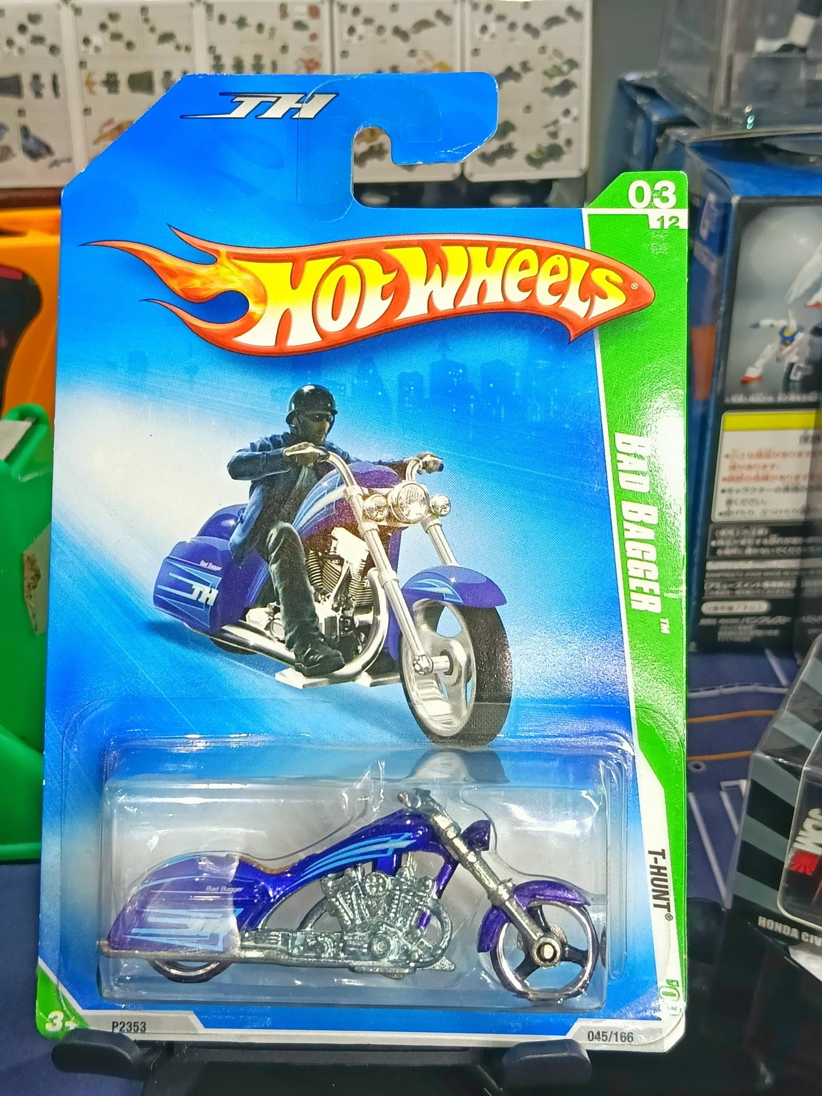 This is a Hot Wheels TH Hunt 2007 Sin Bagger motorcycle in blue metallic finish. It is part of a 12-model series and is number 03 of 12. The motorcycle features detailed chrome engine and parts with realistic styling. The packaging is original and unopened, showcasing the collectible also included protector silica gel if you buy this item