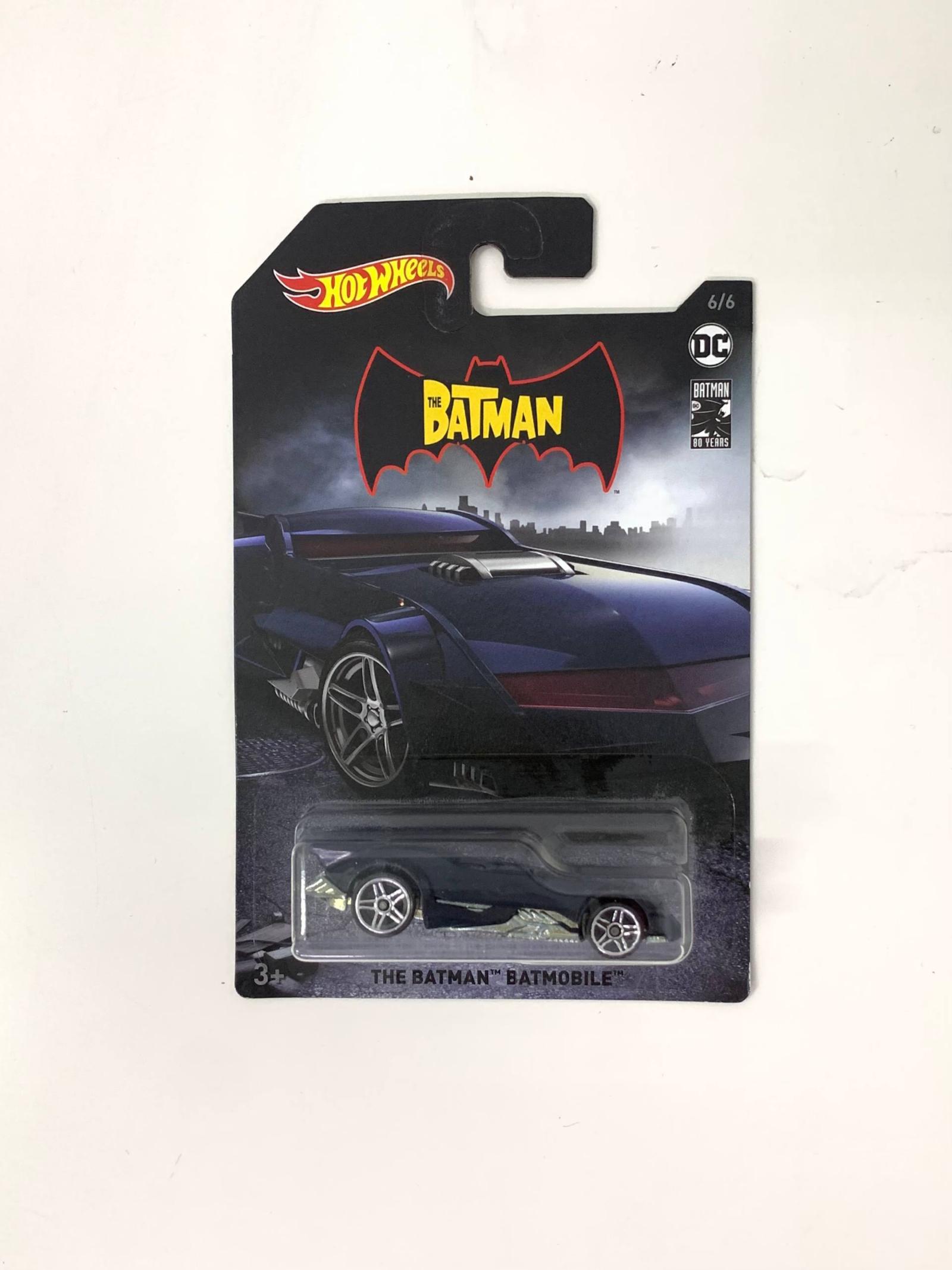 This Hot Wheels collectible features The Batman Batmobile from the 80 Years DC anniversary series. It is number 6 of 6 in the set, designed for ages 3 and up. The packaging is intact and the Batmobile is securely sealed inside the original blister pack, showcasing a sleek black design with detailed wheels and bodywork.