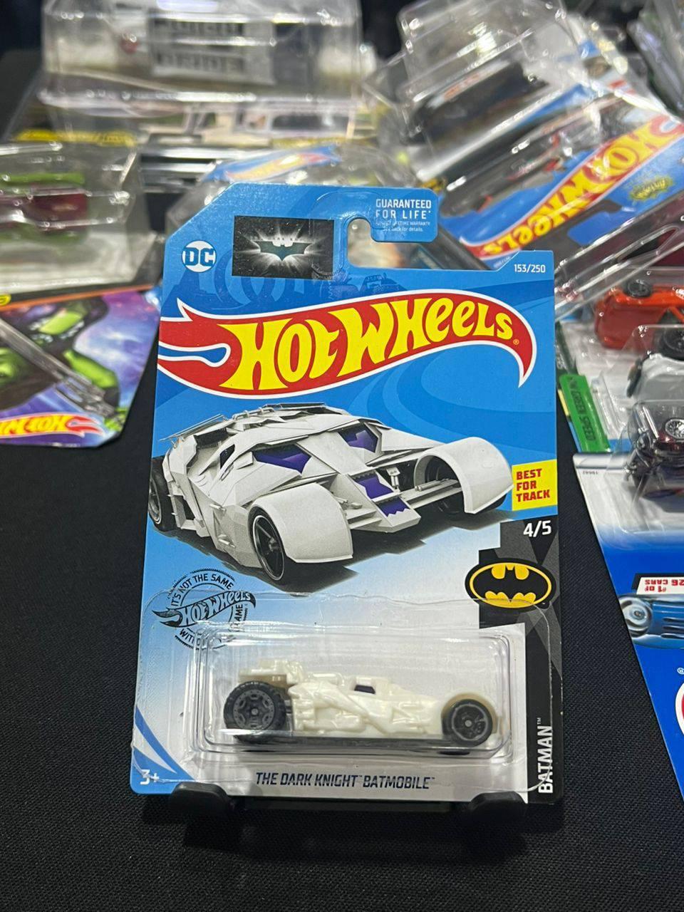 This Hot Wheels collectible features The Dark Knight Batmobile from the Batman series. It is numbered 153 out of 250 and is part of the Batman 4/5 collection. The car shown is a white variant, marked as 'Best For Track'. The packaging is sealed and intact with slight edge wear visible but no major damage, making it suitable for display or play.