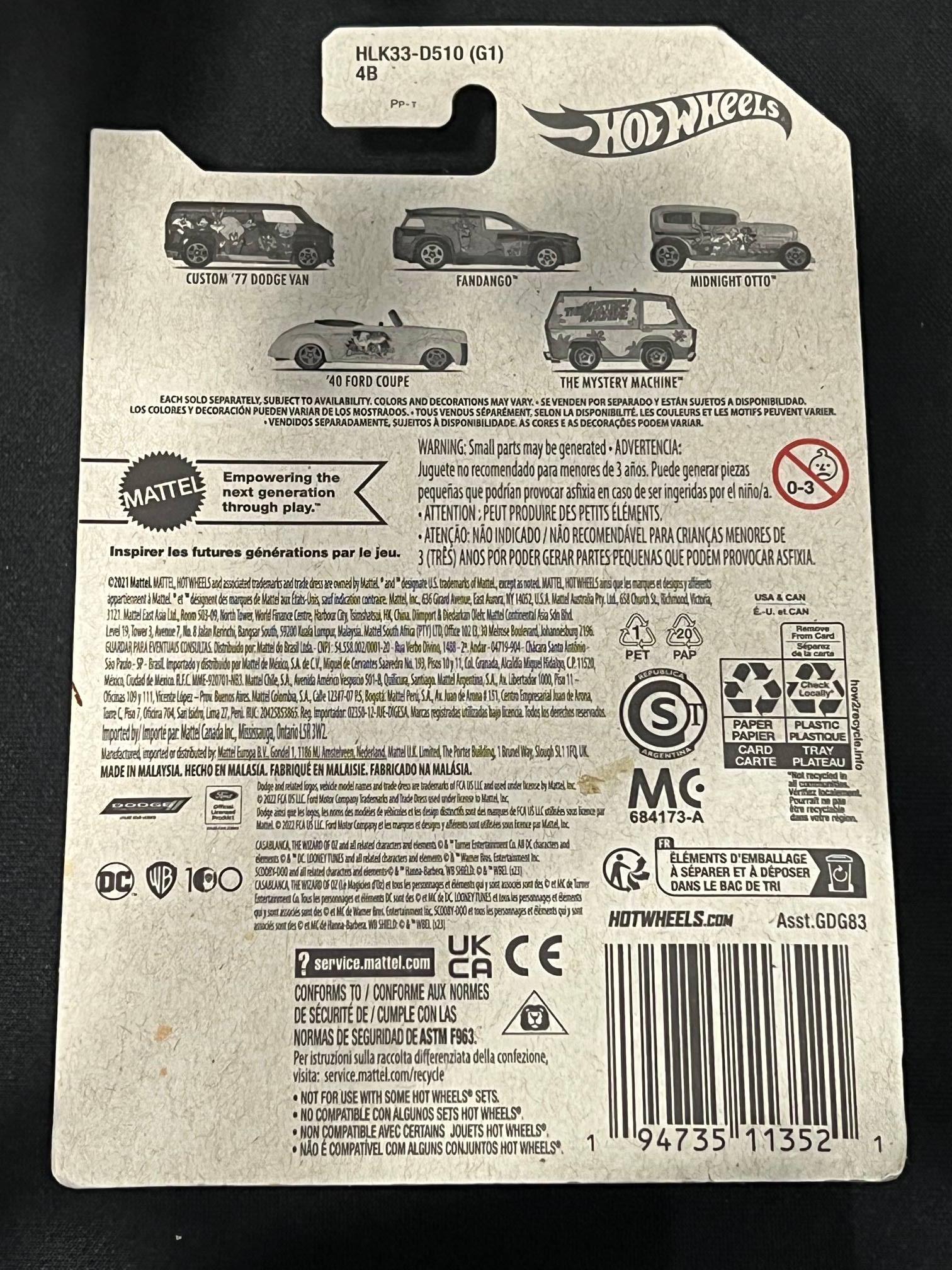 This Hot Wheels collectible features The Mystery Machine van from the iconic Scooby-Doo series, part of the Warner Bros. 100th Anniversary collection. It includes detailed artwork and classic designs with gold-colored wheels. The packaging showcases beloved WB characters and marks 100 years of Warner Bros. Notable for collectors of Hot Wheels and animation memorabilia.