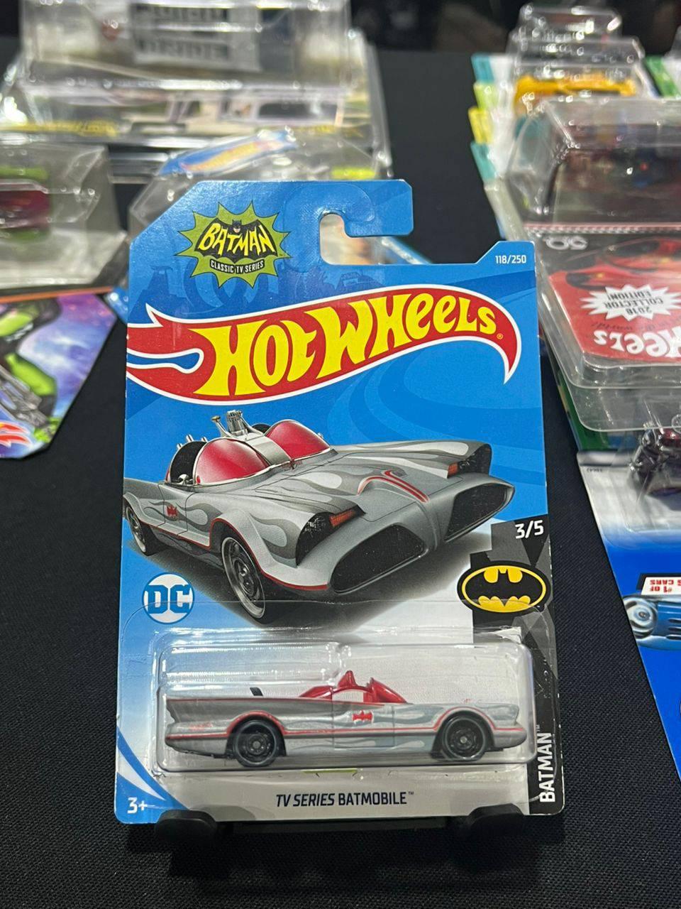 Hot Wheels collectible featuring the TV Series Batmobile from the classic Batman TV series. This model is part of the DC collection, numbered 118 out of 250, and 3 of 5 in the Batmobile series. The packaging is intact with vibrant colors and clear branding, ideal for collectors and Batman fans.