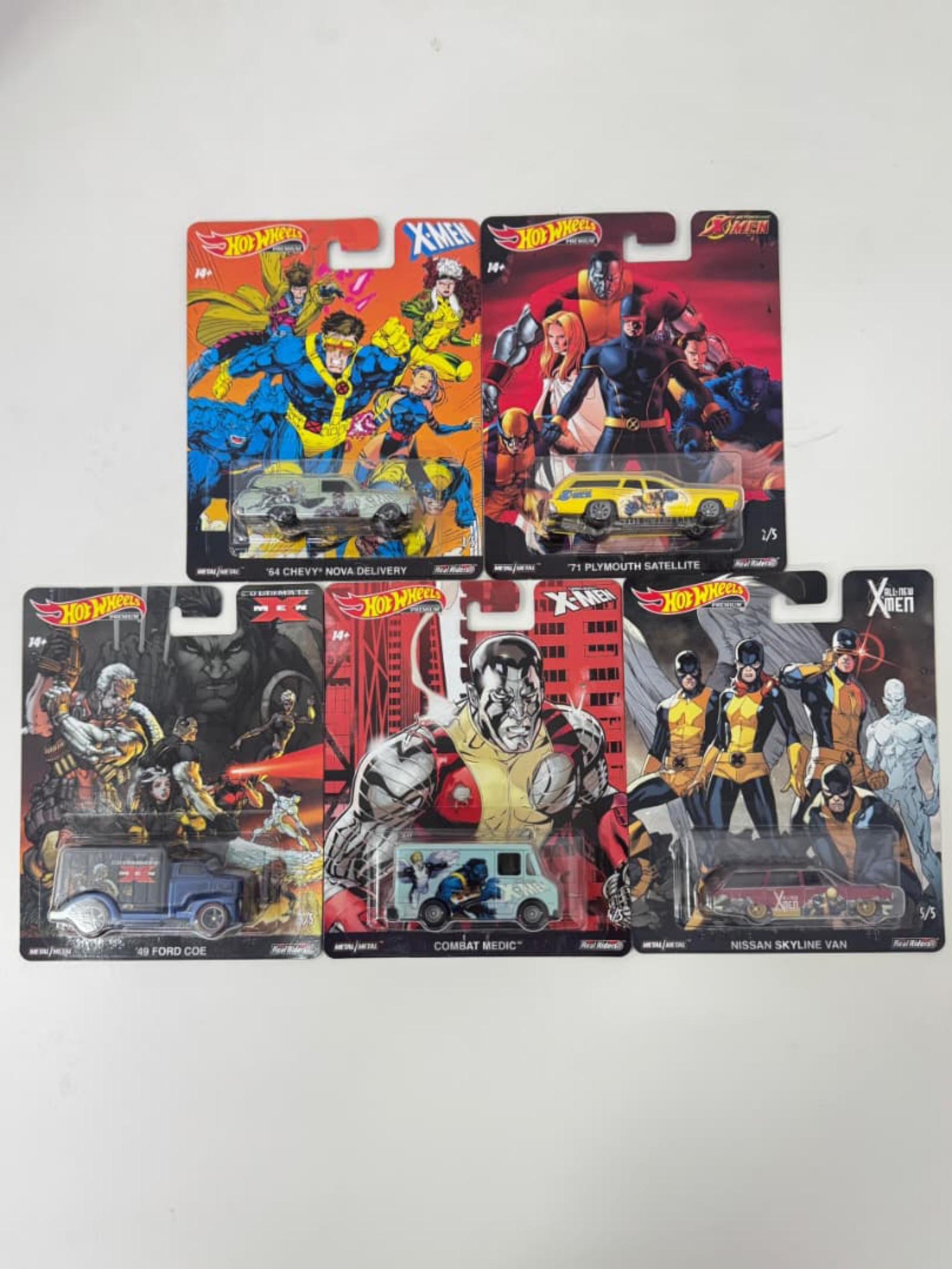 Complete set of 5 Hot Wheels X-Men themed collectible cars featuring classic and comic-inspired designs. Includes '54 Chevy Nova Delivery, '71 Plymouth Satellite, '69 Ford Coe, Combat Medic van, and Nissan Skyline Van, all packaged with detailed X-Men artwork. Ideal for collectors and fans of both Hot Wheels and X-Men memorabilia.