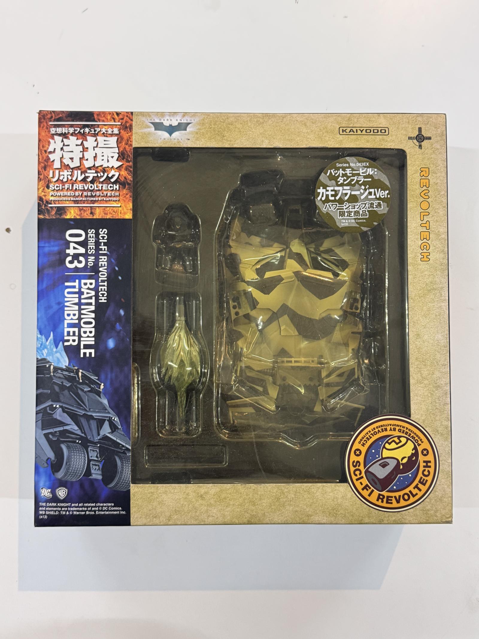 Kaiyodo Sci-Fi Revoltech Series No. 043 Batmobile Tumbler Camouflage Version collectible figure. Features detailed design from The Dark Knight series with a unique camouflage paint scheme. Includes interchangeable parts displayed in original packaging. A must-have for Batman and Hot Wheels collectors.