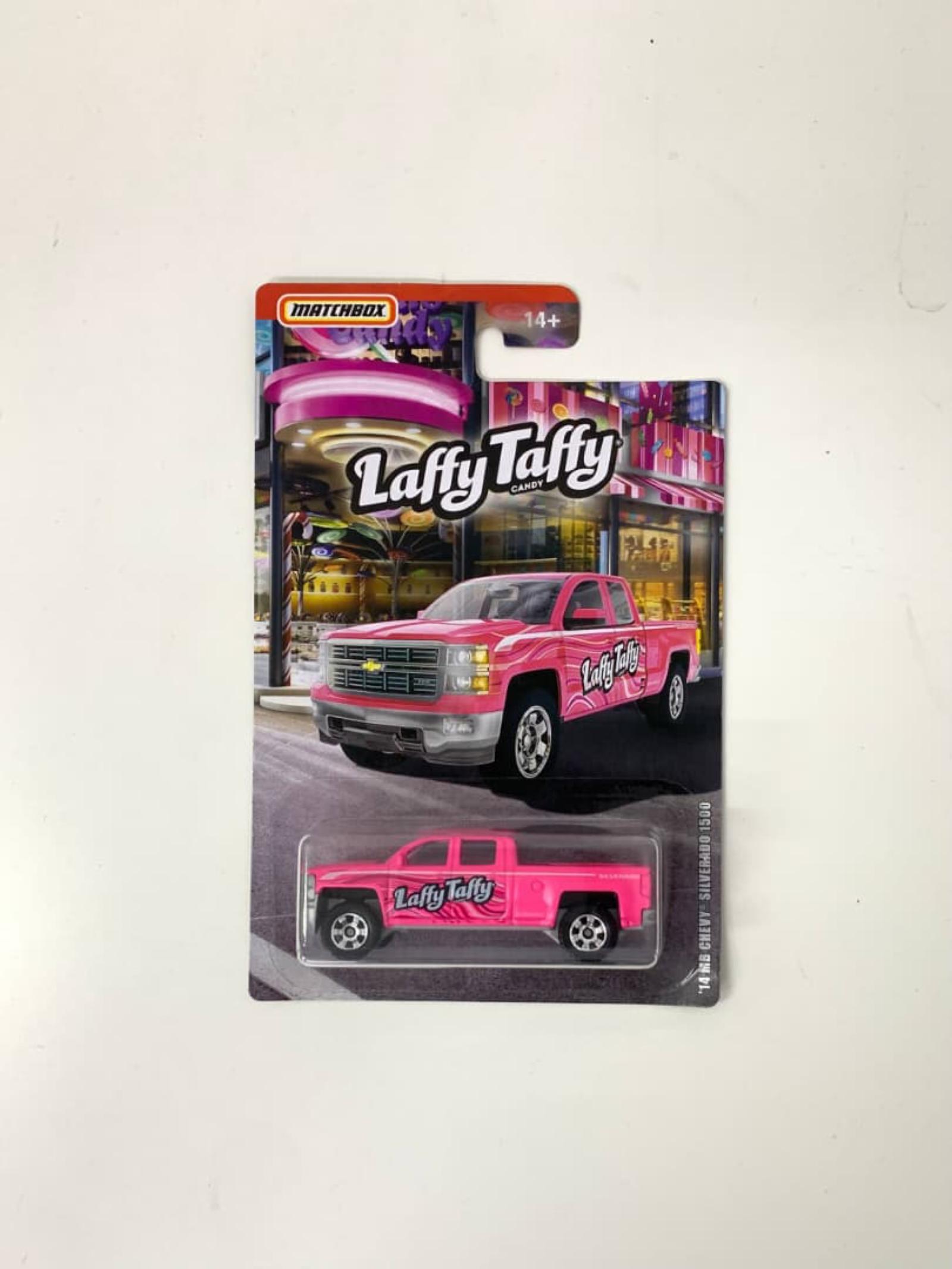 This Matchbox 2016 Chevy Silverado 1500 diecast truck features a vibrant pink Laffy Taffy candy branding design. The vehicle is presented in its original sealed packaging, making it a great collectible for fans of Matchbox vehicles and candy-branded models.