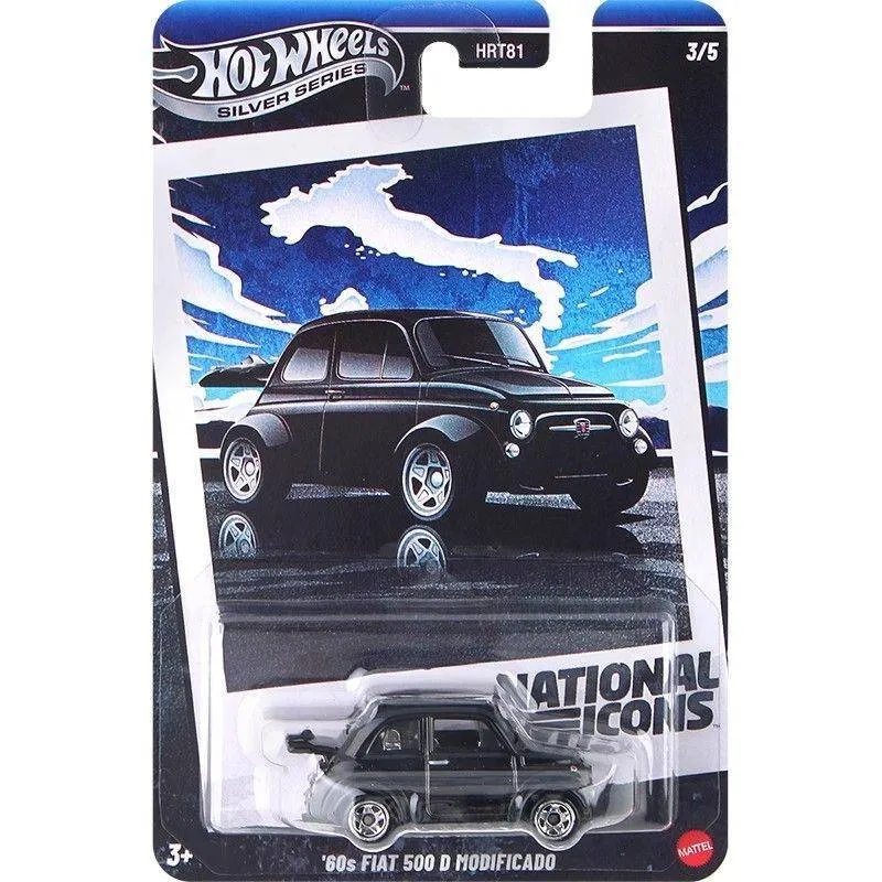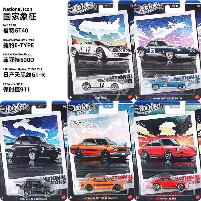 Very good, ungraded, complete five-car set from Hot Wheels’ Silver Series “National Icons” release. Each vehicle remains sealed in its original blister card packaging and includes the numbered pack artwork (1/5 through 5/5). This lot contains: Ford GT-40 (1/5), Jaguar Lightweight E-Type (2/5), ’60s Fiat 500D Modificado (3/5), 1971 Nissan Skyline HT 2000 GT‑R (4/5), and ’67 Porsche 911 R (5/5).