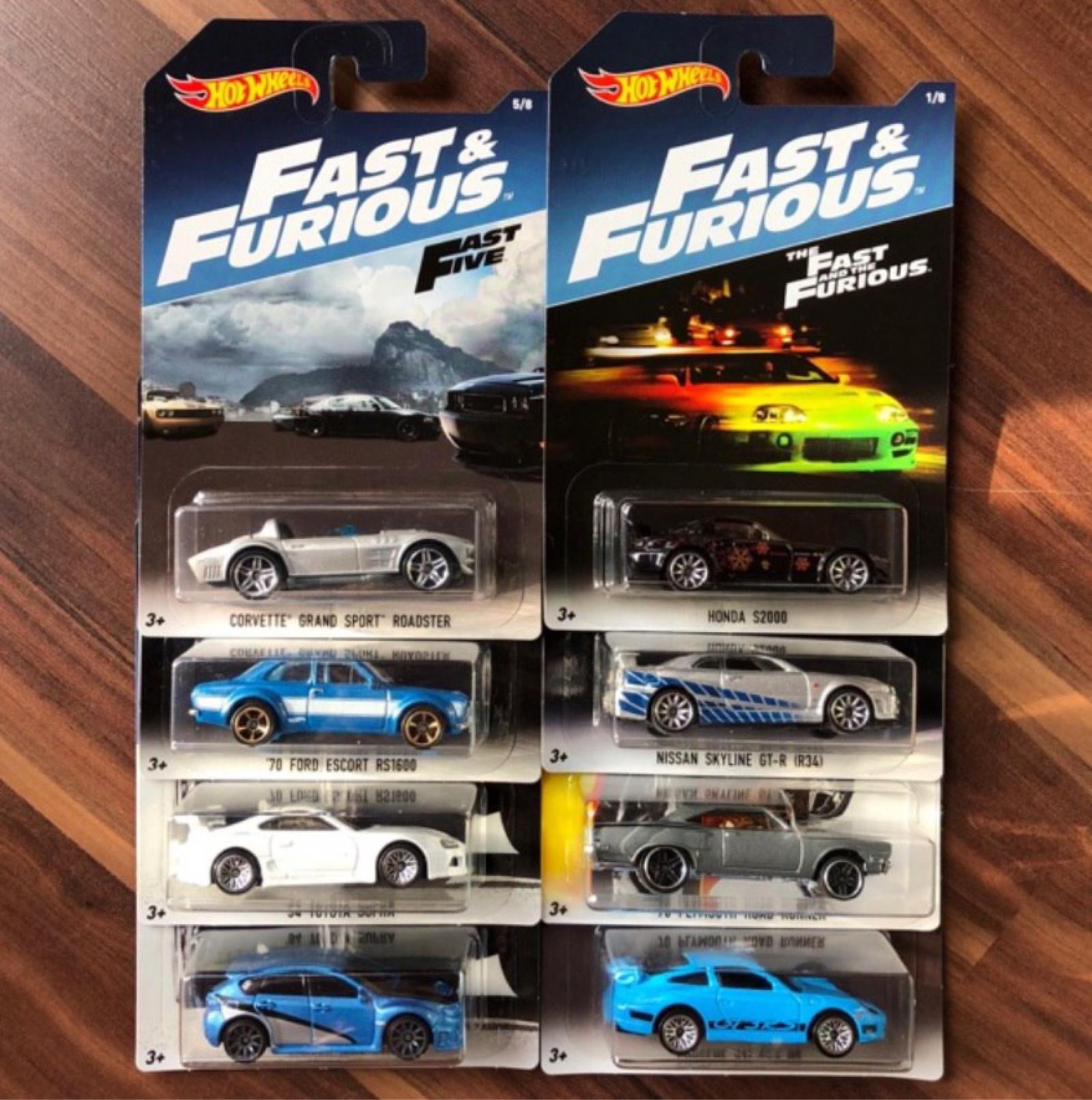 Complete set of 8 Hot Wheels Fast & Furious diecast cars, featuring iconic models like Corvette Grand Sport Roadster, Honda S2000, '70 Ford Escort RS1600, Nissan Skyline GT-R (R34), and several others. Each car is in original factory sealed blister packaging with vibrant Fast & Furious themed backing cards. Perfect for collectors and fans of the movie franchise.