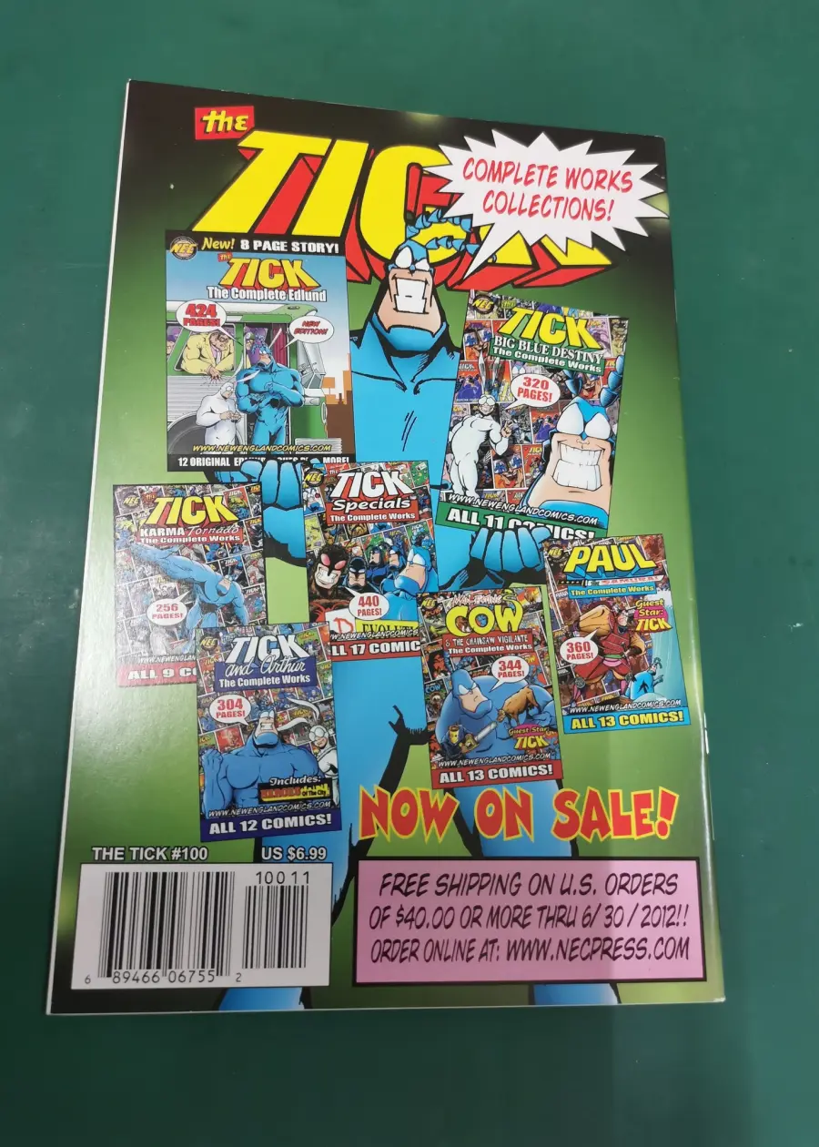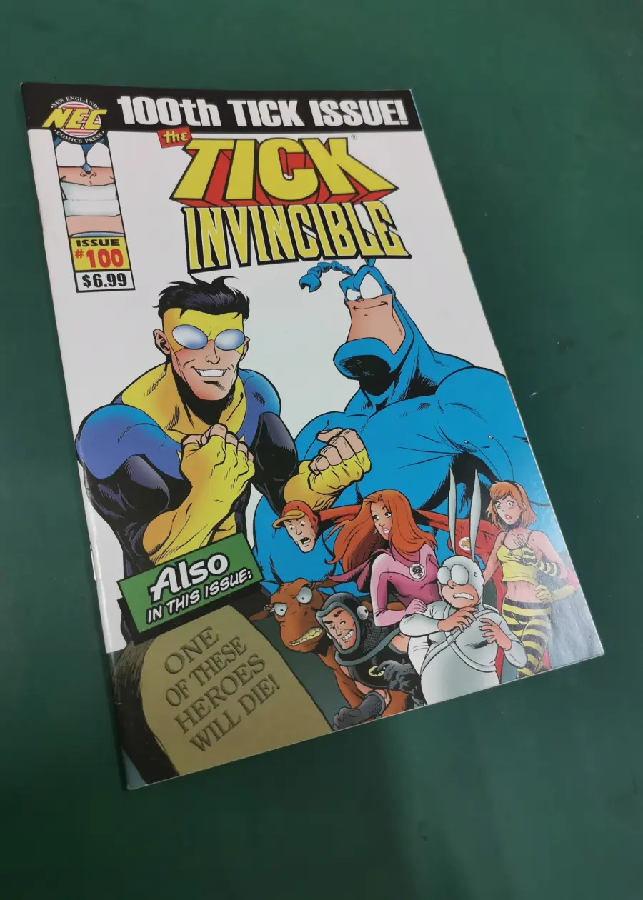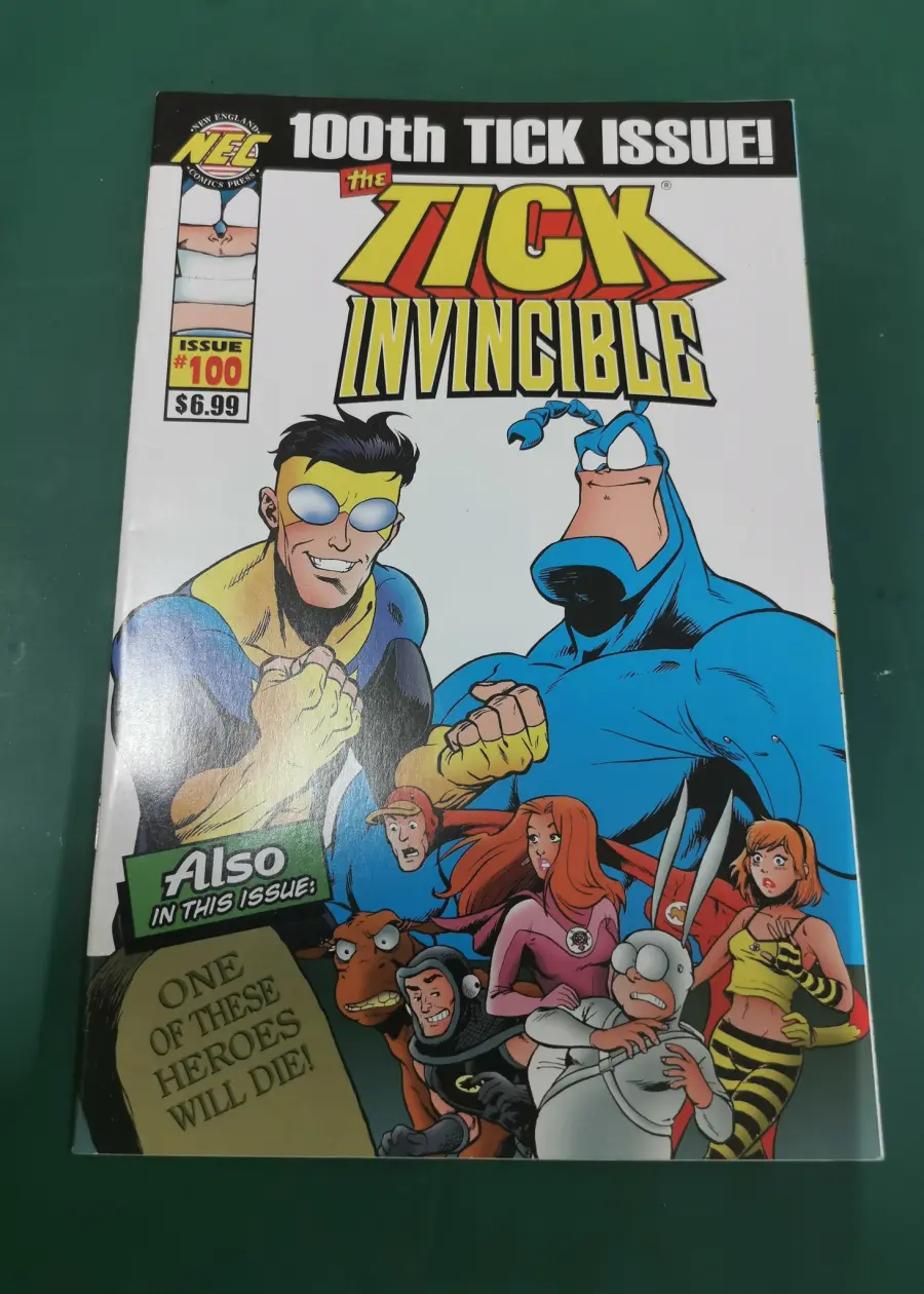 - (W) Benito Cereno (A/CA) Les McClaine Celebrate the 100th issue of The Tick with a 48-page full-color blockbuster co-starring Robert Kirkman's Invincible! In a full-length 24-page epic, Invincible is transported to The Tick's universe where the two mighty heroes confront the combined threat of the master criminal Chairface Chippendale and a mysterious and menacing new villain who makes even Chairface look like an ordinary umbrella stand! A story so awesome it requires two planets and at least one moon to contain it! Added bonus, 'The Story of The Tick,' a 20-page full-color history of The Tick's illustrious career!