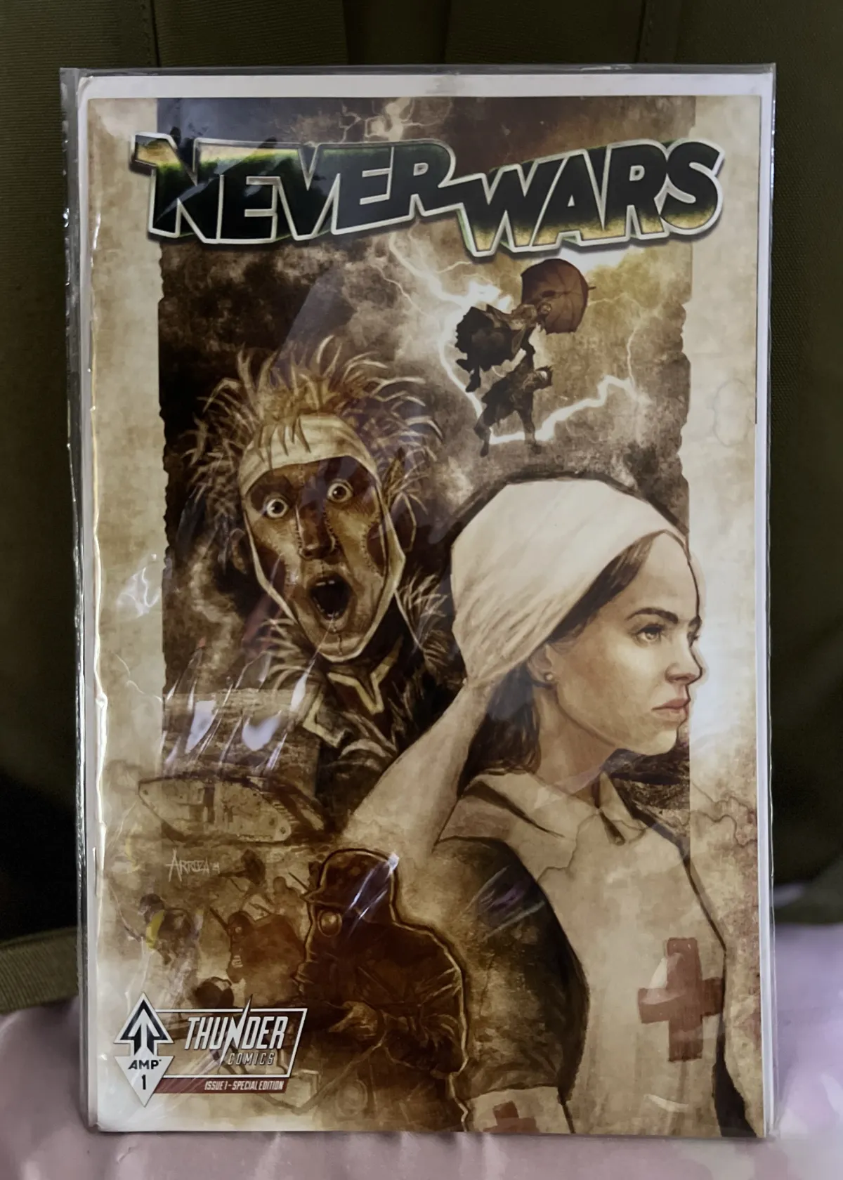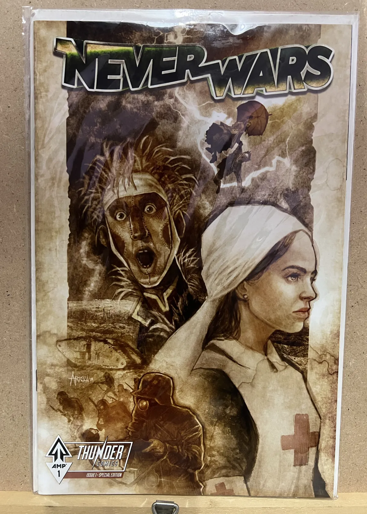 This is a raw, ungraded copy of Neverwars Issue #1 Special Edition, published by Thunder Comics under their AMP imprint. The cover art, which is signed by the artist Arriaga (2021), features a striking sepia-toned illustration with wartime imagery, including a nurse, soldier, and dramatic expressions evoking the tension and emotional weight of war. As an indie/small press comic, this issue is a collectible item for enthusiasts of independent comic storytelling. The raw condition means it is without professional grading but still suitable for collectors who appreciate indie series and special editions with unique artistic styles. This edition may appeal to those interested in war-themed narratives or looking to build a niche comic collection.