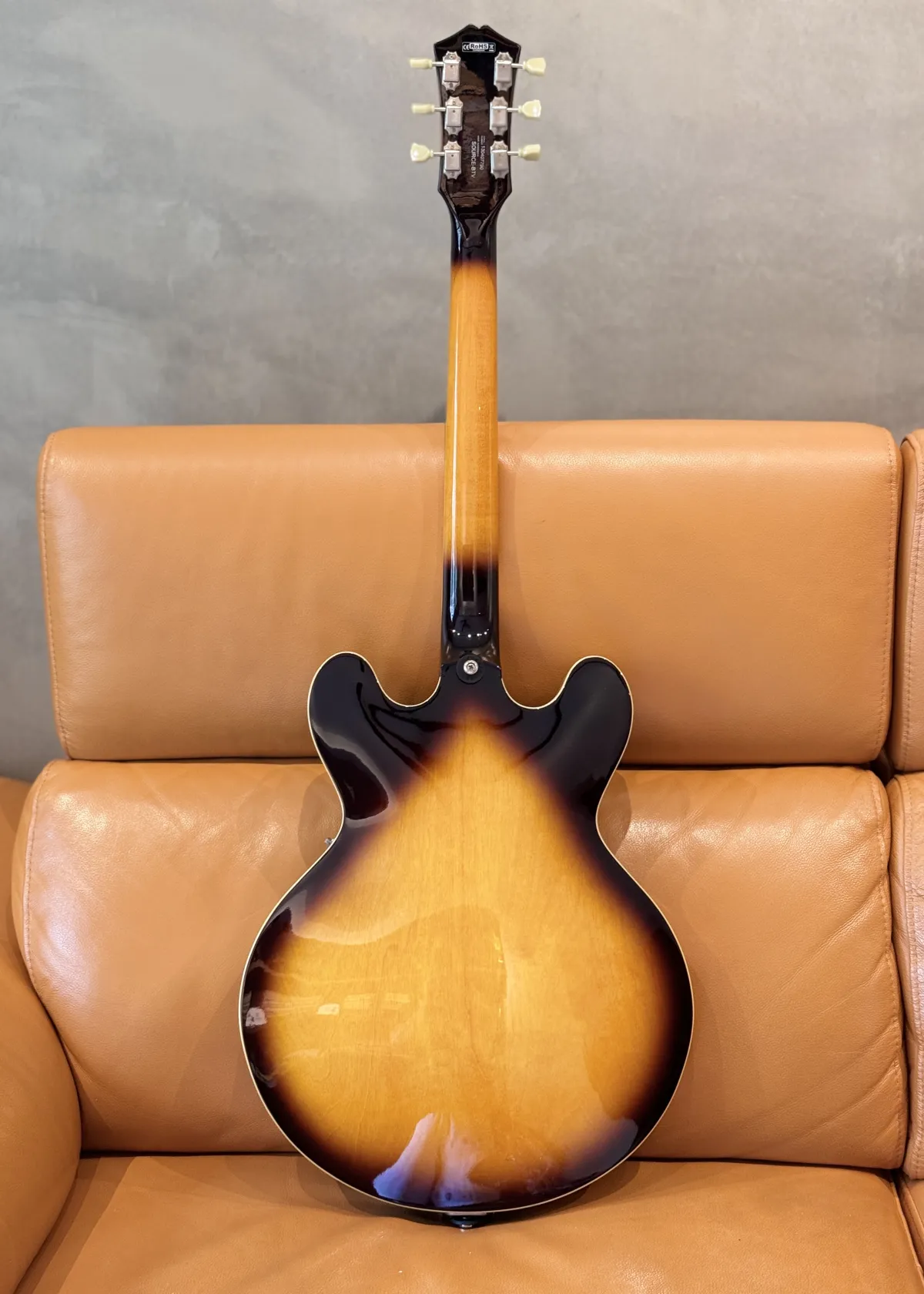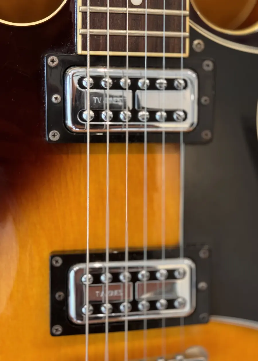 Set in neck Maple top, back & sides Rosewood fretboard 12” radius 22 frets 24 3/4 scale Bigsby B70 Tv Jones filtertron pickups Classic tobacco burst finish