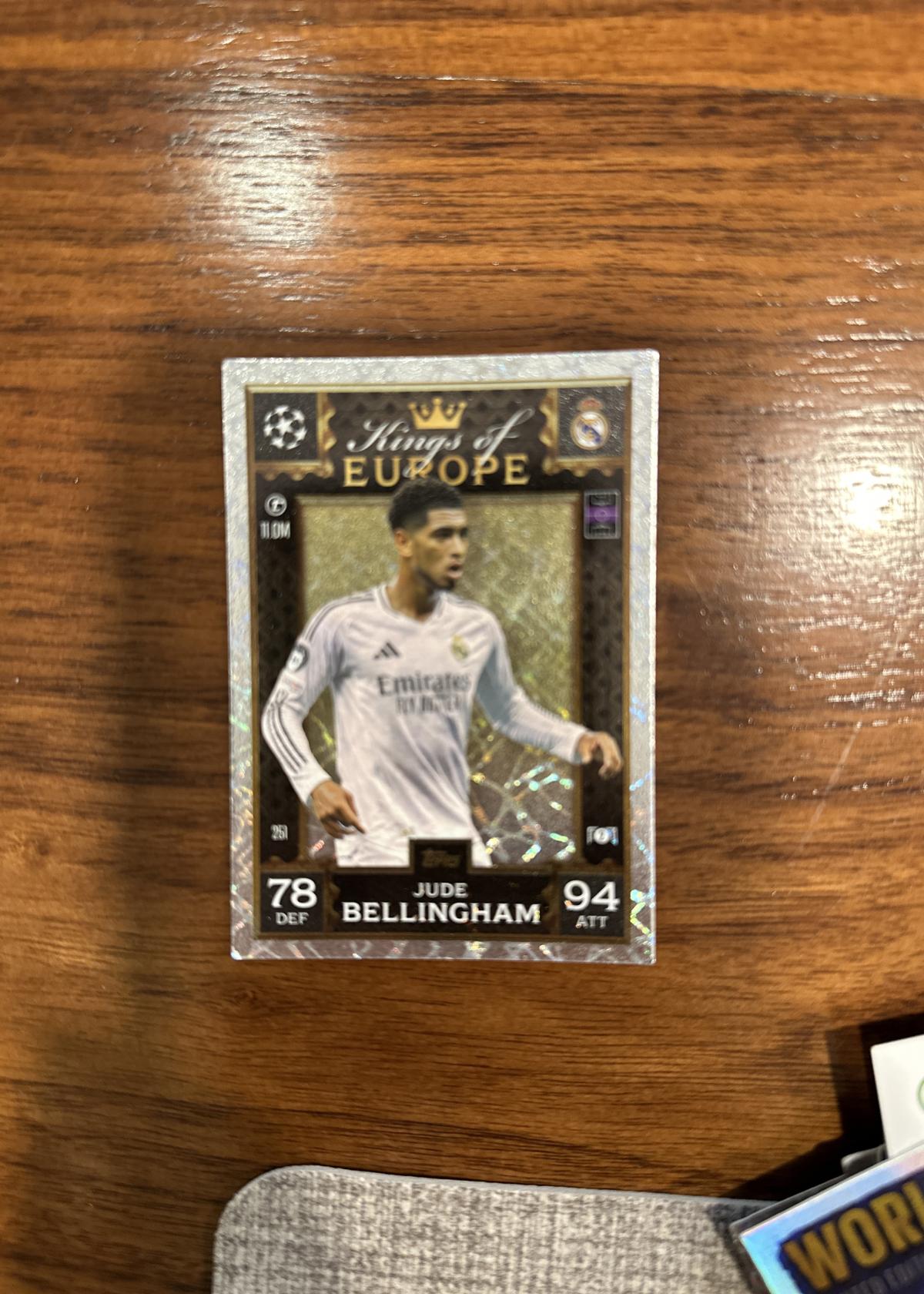 The Match Attax 24/25 Extra Kings of Europe Jude Bellingham Trading Card is a collectible item from the 2024-2025 Topps Match Attax Extra series. This card features Jude Bellingham in his Real Madrid kit, highlighting his impressive stats with 78 defense and 94 attack. The card is adorned with a holographic border, enhancing its visual appeal. As part of the 'Kings of Europe' subset, it celebrates Bellingham's contributions to European football. This card is a must-have for football enthusiasts and collectors, offering a blend of aesthetic design and player recognition.