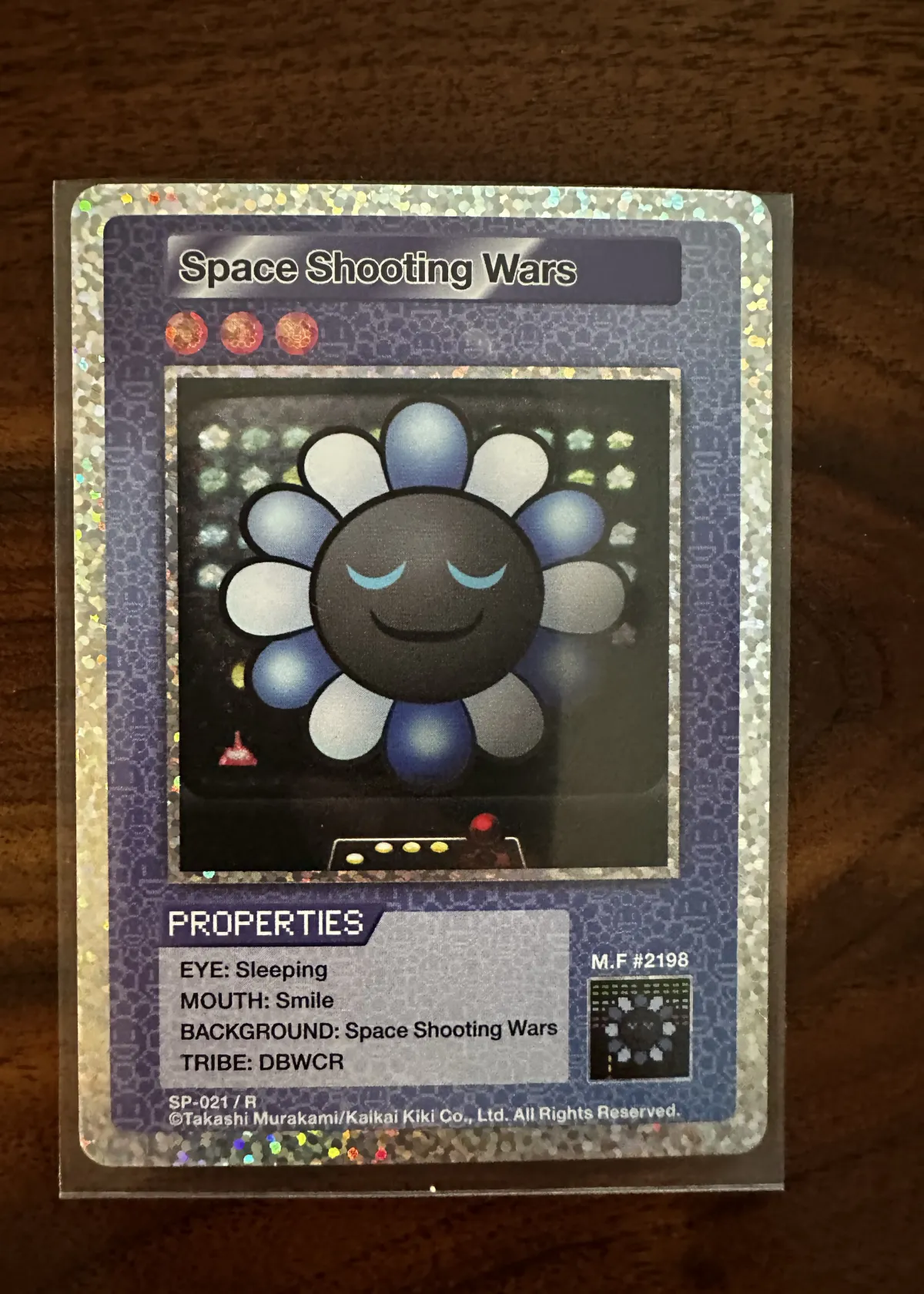 The 'Murakami.flowers Collectible Card - Space Shooting Wars (SP-021)' is a distinctive piece from the 108 Flowers Revised series by renowned artist Takashi Murakami. This card features a holographic border that enhances its visual appeal, framing the central image of a serene blue and white flower with a sleeping expression. Key attributes include: Eye - Sleeping, Mouth - Smile, Background - Space Shooting Wars, and Tribe - DBWCR, indicating its inclusion in a broader collection. Classified with a rarity level of 'R' and designated as card number SP-021, this collectible is highly sought after by enthusiasts of Murakami's art and trading card collectors alike. Its ungraded, raw condition allows collectors to personally assess its state, adding to its allure and potential value.