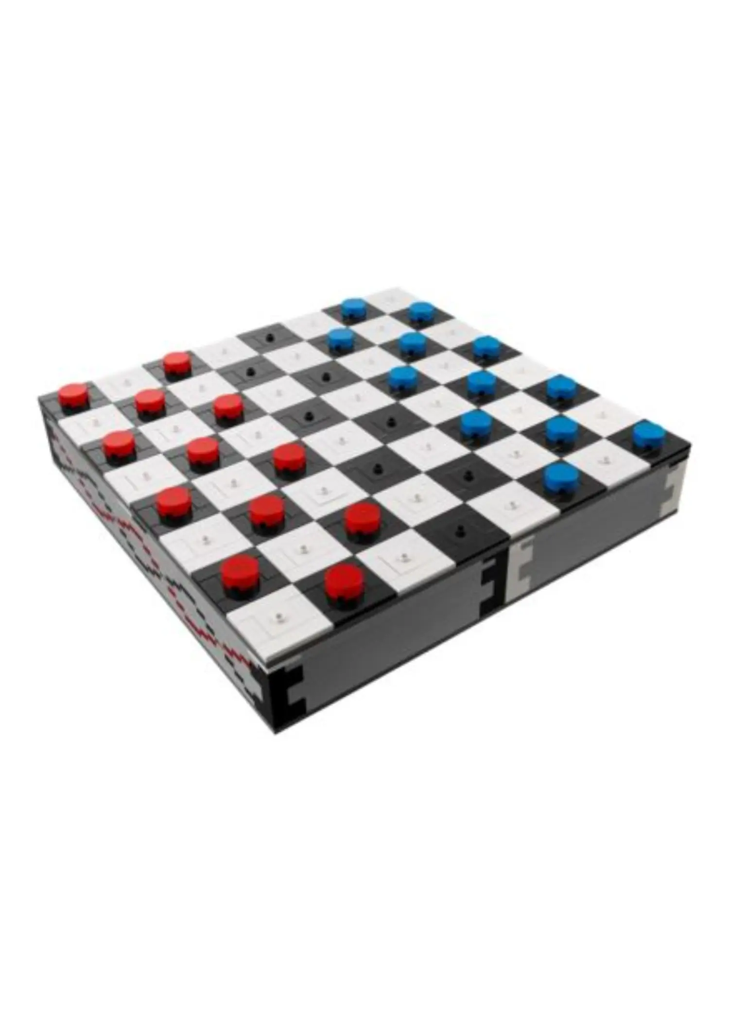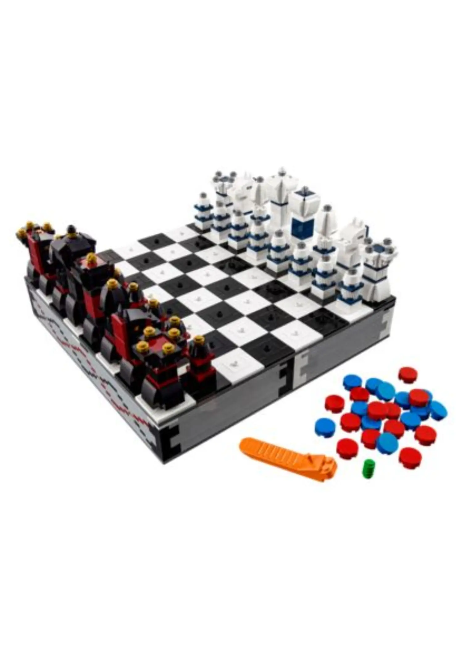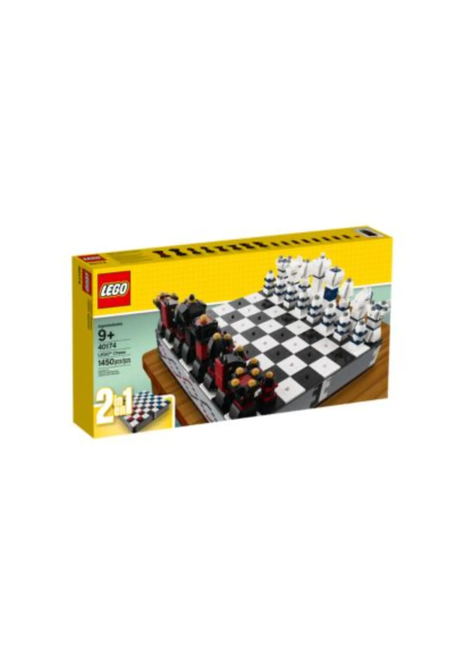 LEGO 40174 Chess is an Exclusive set released in 2017, containing 1,450 pieces. The set builds a full chessboard with integrated storage compartments beneath the playing surface for all pieces. It includes two complete sets of brick-built chess and checkers pieces, allowing players to use the model for both games. The design features a sturdy, tile-based board with contrasting black and white squares and removable sections for easy access to the storage area.