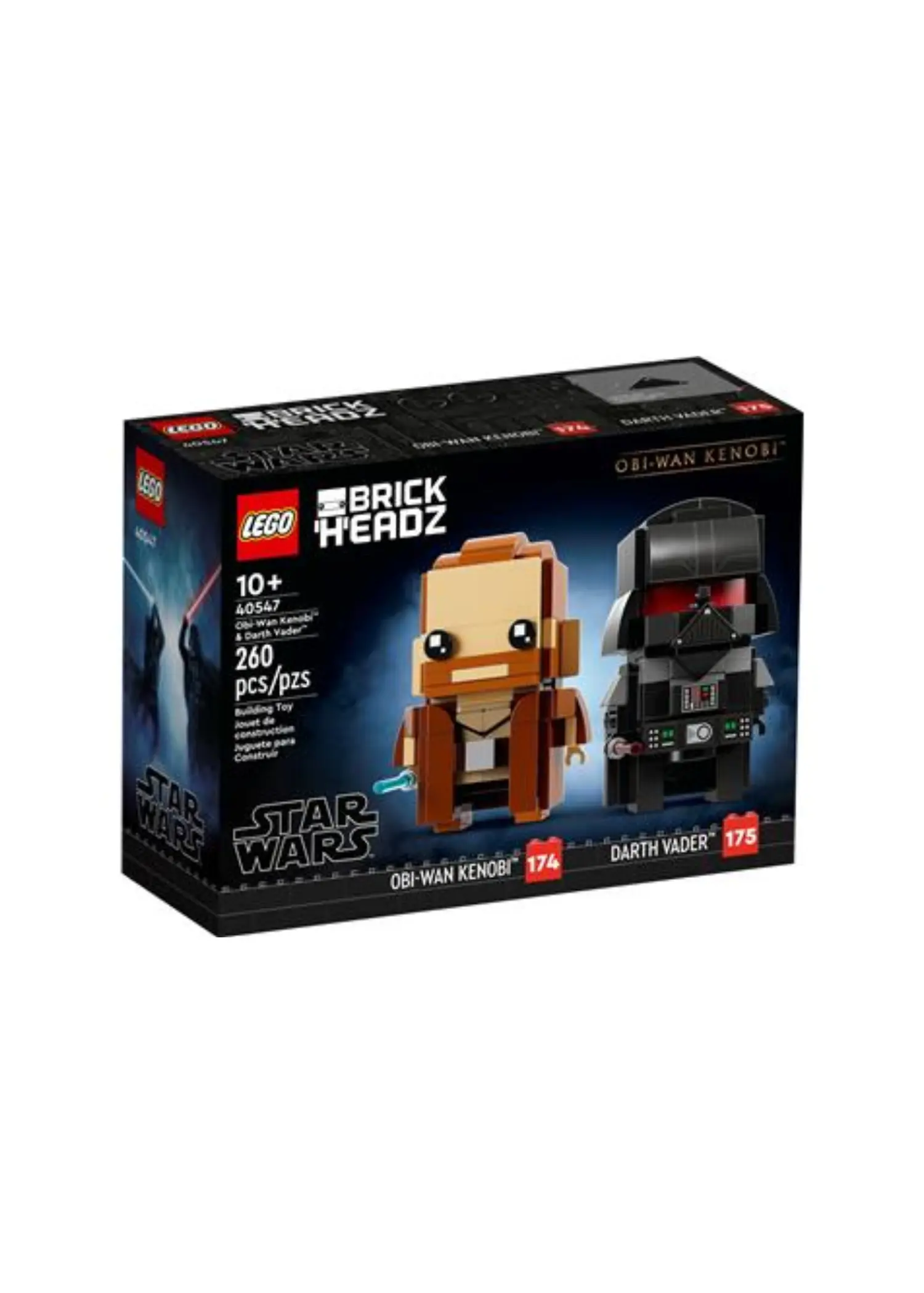 LEGO 40547 Obi-Wan Kenobi and Darth Vader is a BrickHeadz Star Wars set released in 2022, containing 260 pieces. The double pack depicts buildable BrickHeadz versions of Obi-Wan Kenobi and Darth Vader as seen in the Disney+ series Obi-Wan Kenobi. The characters are numbered BrickHeadz No. 174 (Obi-Wan Kenobi) and No. 175 (Darth Vader). The set was briefly available at Star Wars Celebration in May 2022.