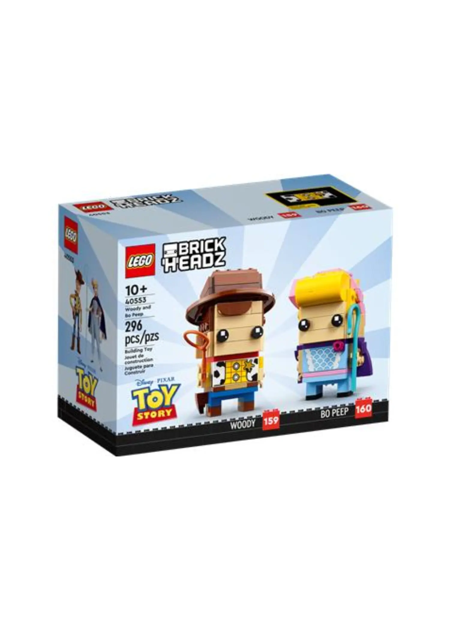 LEGO 40553 Woody & Bo Peep is a 296 piece BrickHeadz set released in 2022. It features buildable figures of Woody and Bo Peep from Disney and Pixar's Toy Story, with authentic details like Woody’s cowboy outfit and Bo Peep’s hair bow and shepherd’s crook.