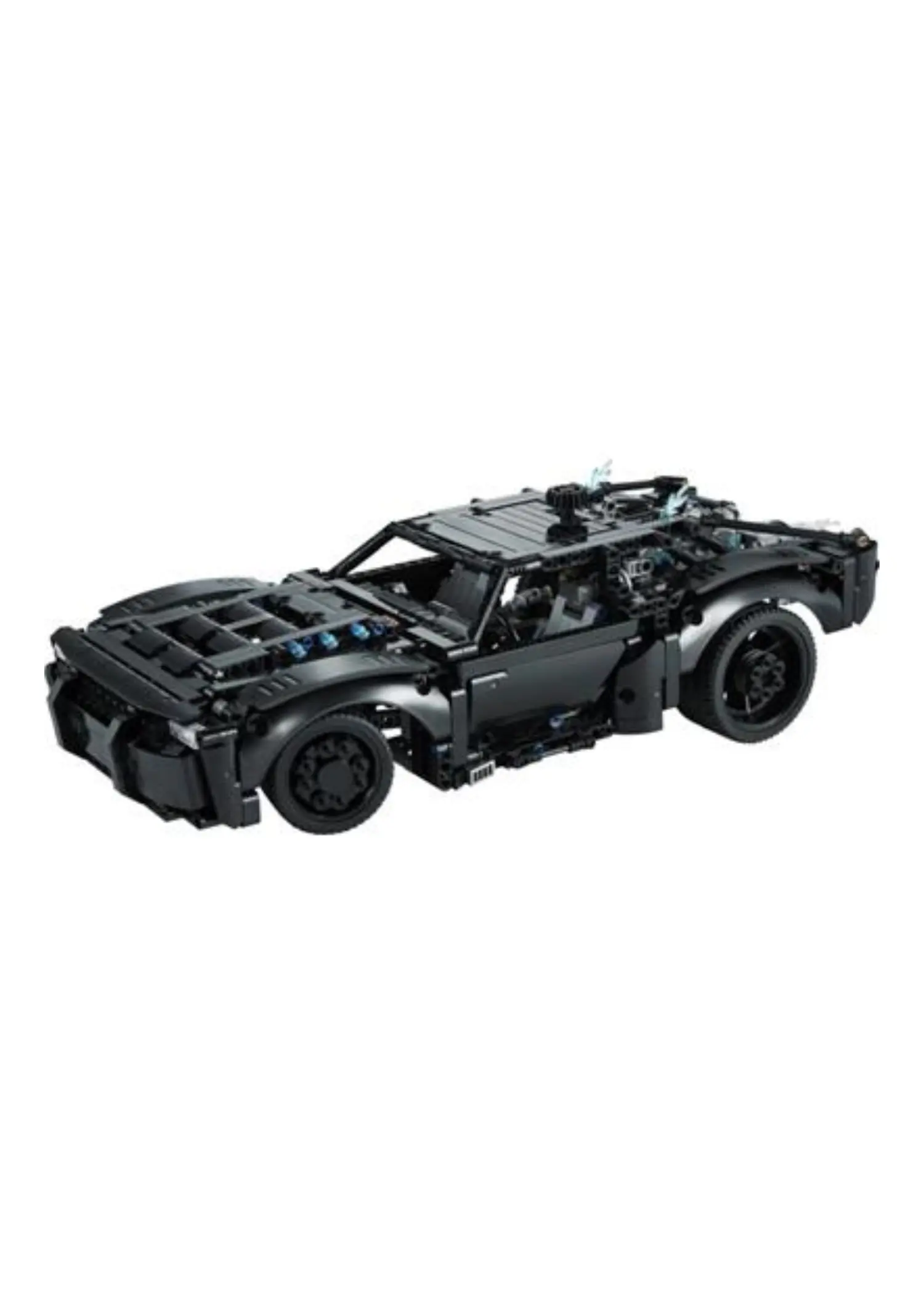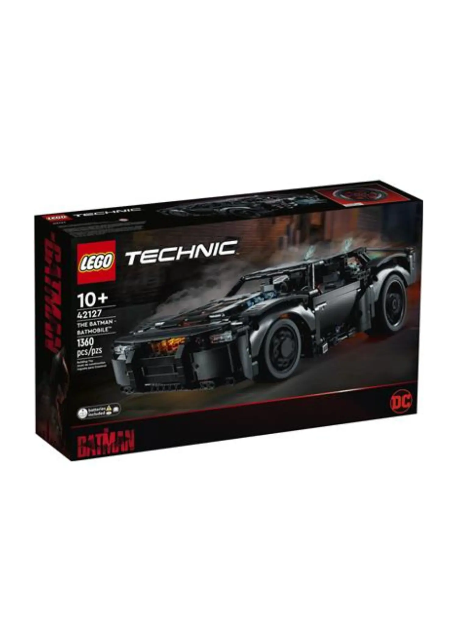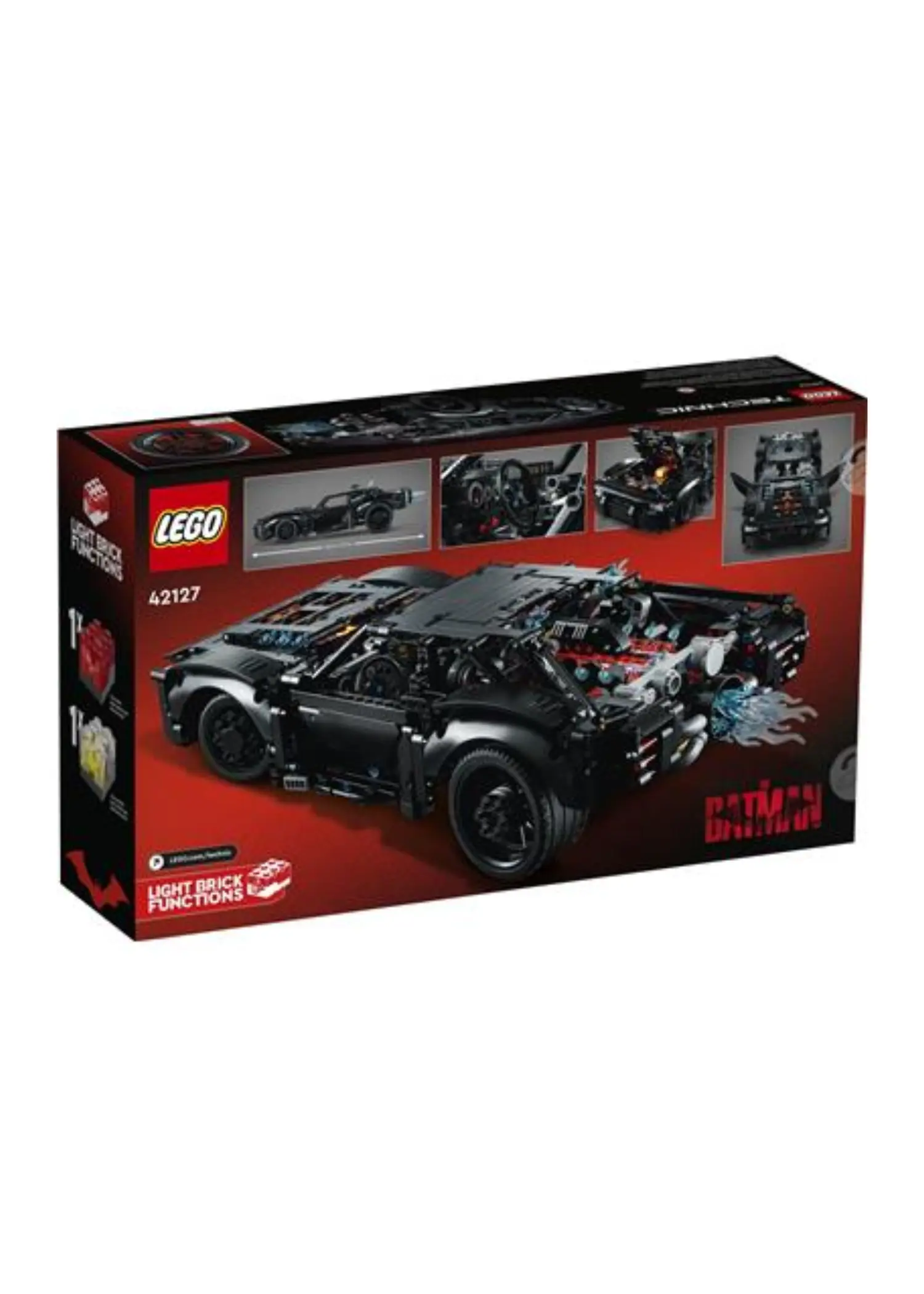 LEGO 42127 The Batman - Batmobile is a 1,360 piece Technic set released in 2022. It features light bricks, steering, differential, spinning flame, and opening doors and hood, and is based on the Batmobile from the 2022 THE BATMAN film.
