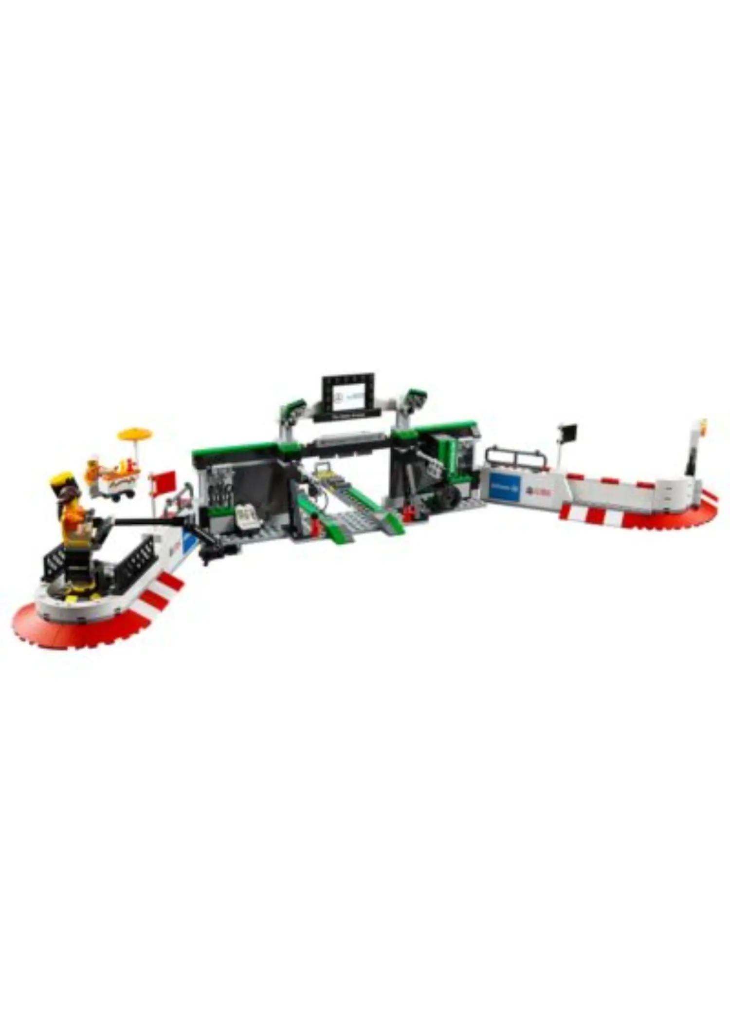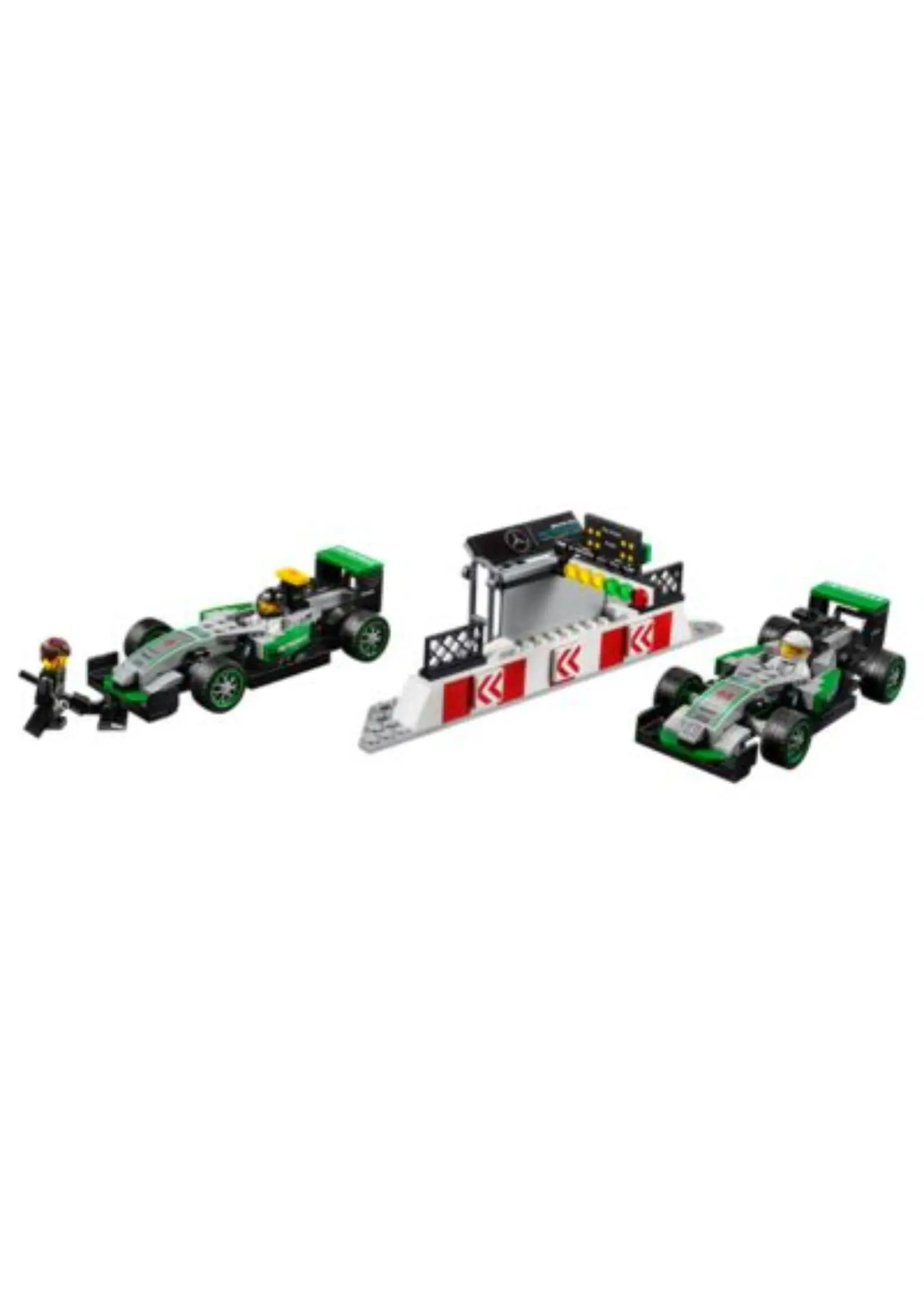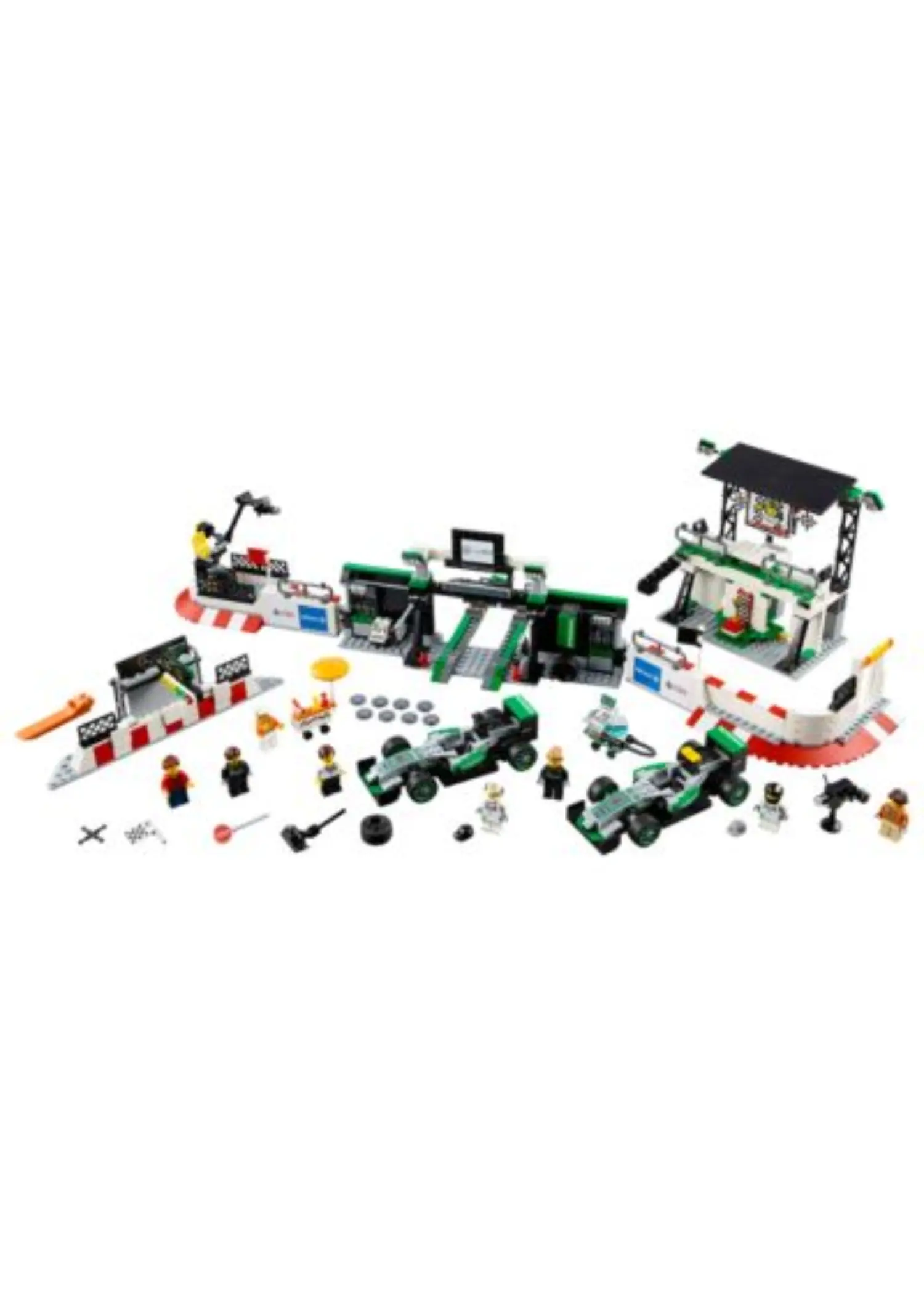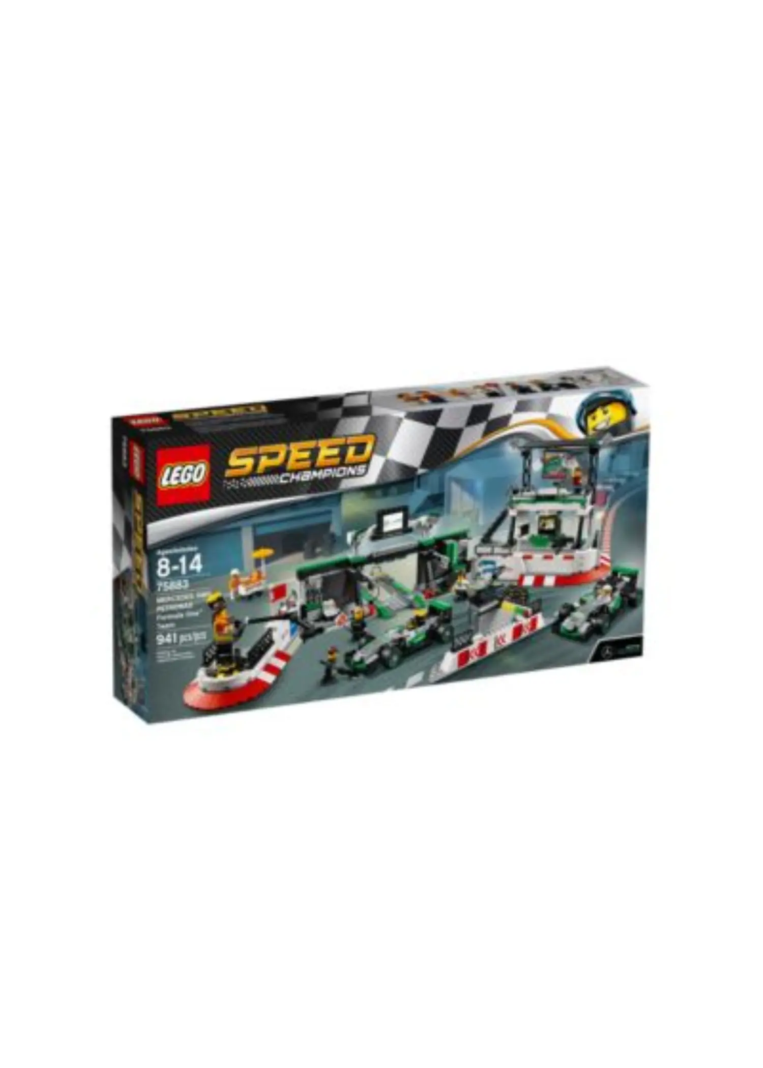 LEGO 75883 Mercedes AMG Petronas Formula One Team is a 941 piece Speed Champions set with 8 minifigs released in 2017. It features two buildable Mercedes F1 W07 Hybrid cars, a fully equipped pit garage with car jack function, a pit wall with monitor and checkered flag, a translucent start-finish light, a TV camera rig, and a grandstand.