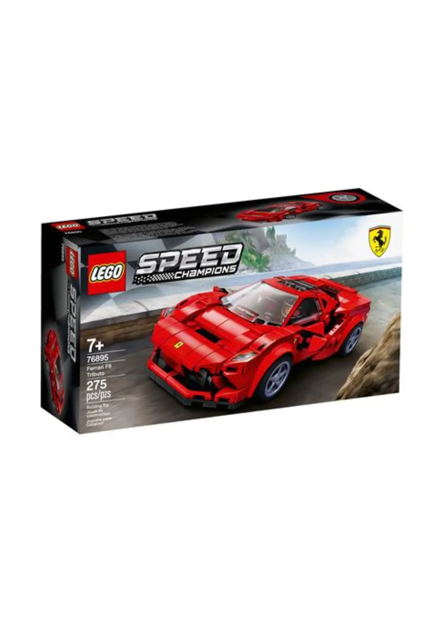 LEGO 76895 Ferrari F8 Tributo is a Speed Champions Ferrari set released in 2020, containing 275 pieces and 1 minifigure. It builds a red mini replica of the Ferrari F8 Tributo and was among the first Speed Champions models produced at the then-new 8-stud-wide scale. The set includes a Ferrari racing driver minifigure with a racing helmet.