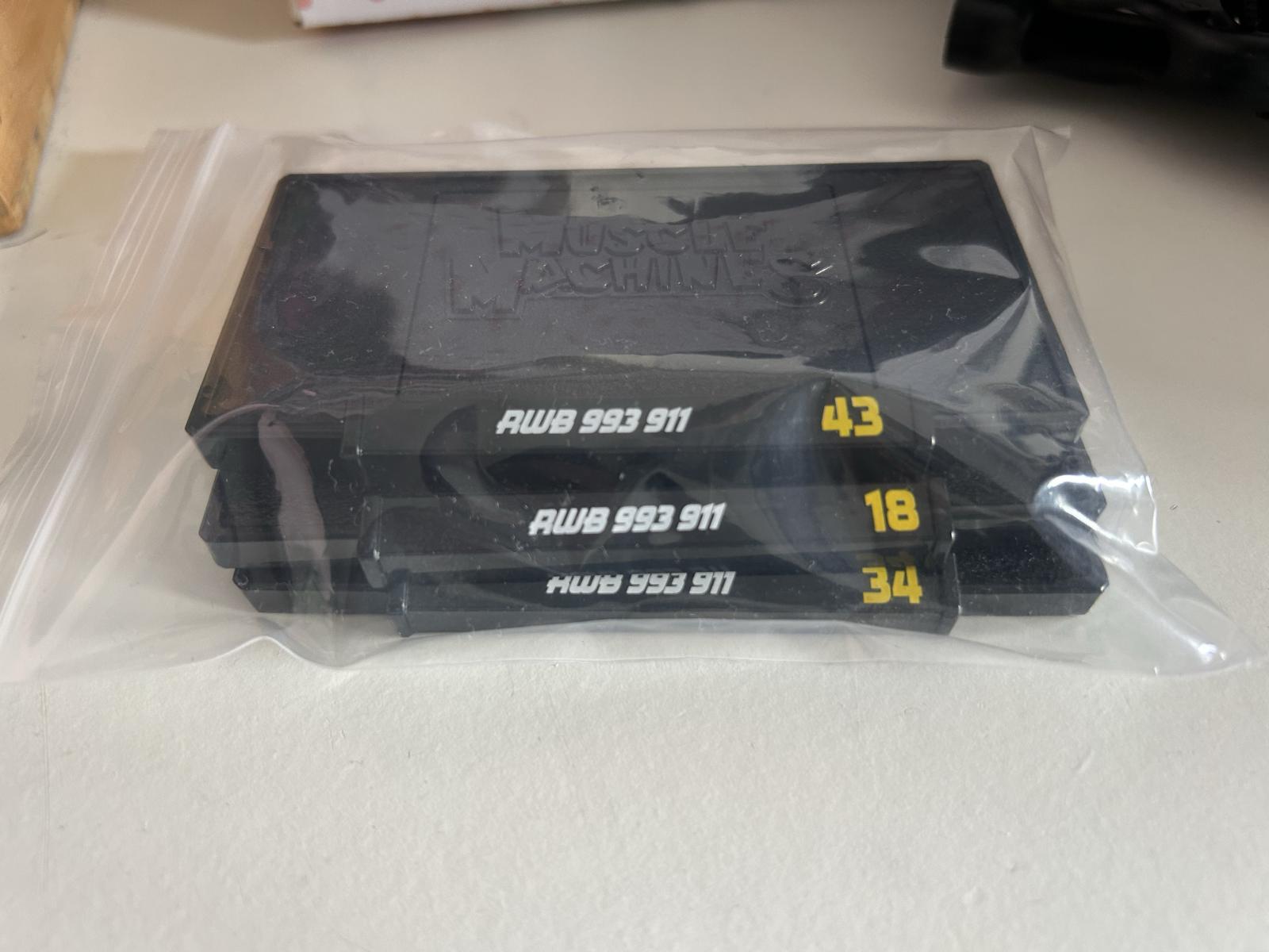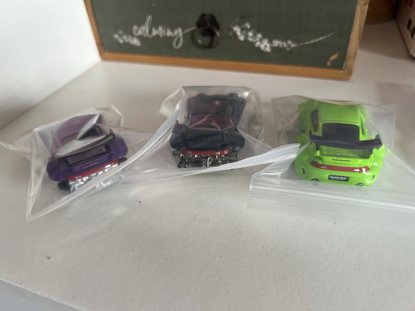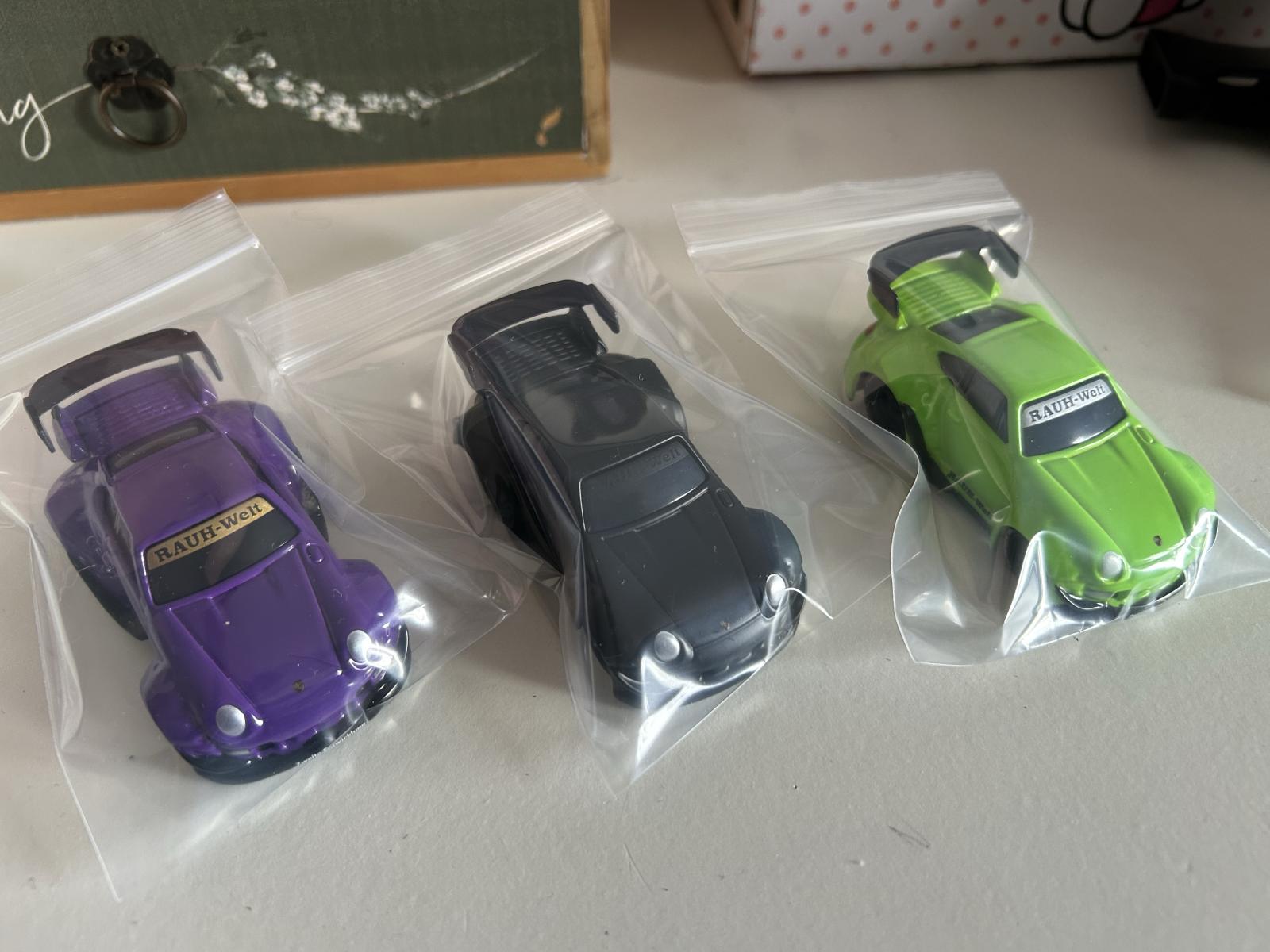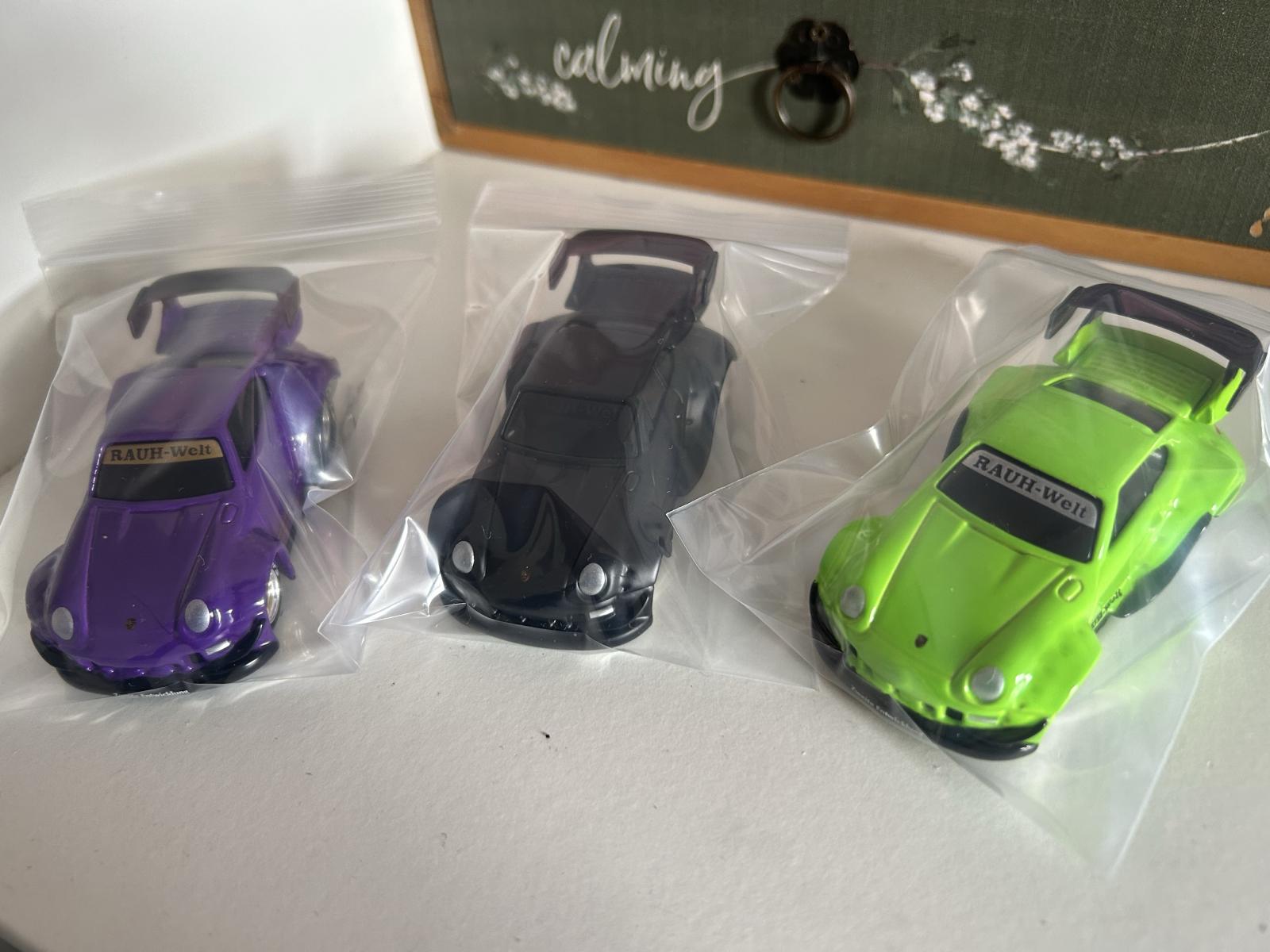 This limited edition collectible set features three RAUH-Welt BEGRIFF (RWB) Porsche 993 model cars in vibrant purple, black, and green colors. Each car is sealed individually in a plastic bag and comes with a branded display case with numbering details (43, 18, 34). Perfect for collectors of rare automotive memorabilia and model car enthusiasts.
