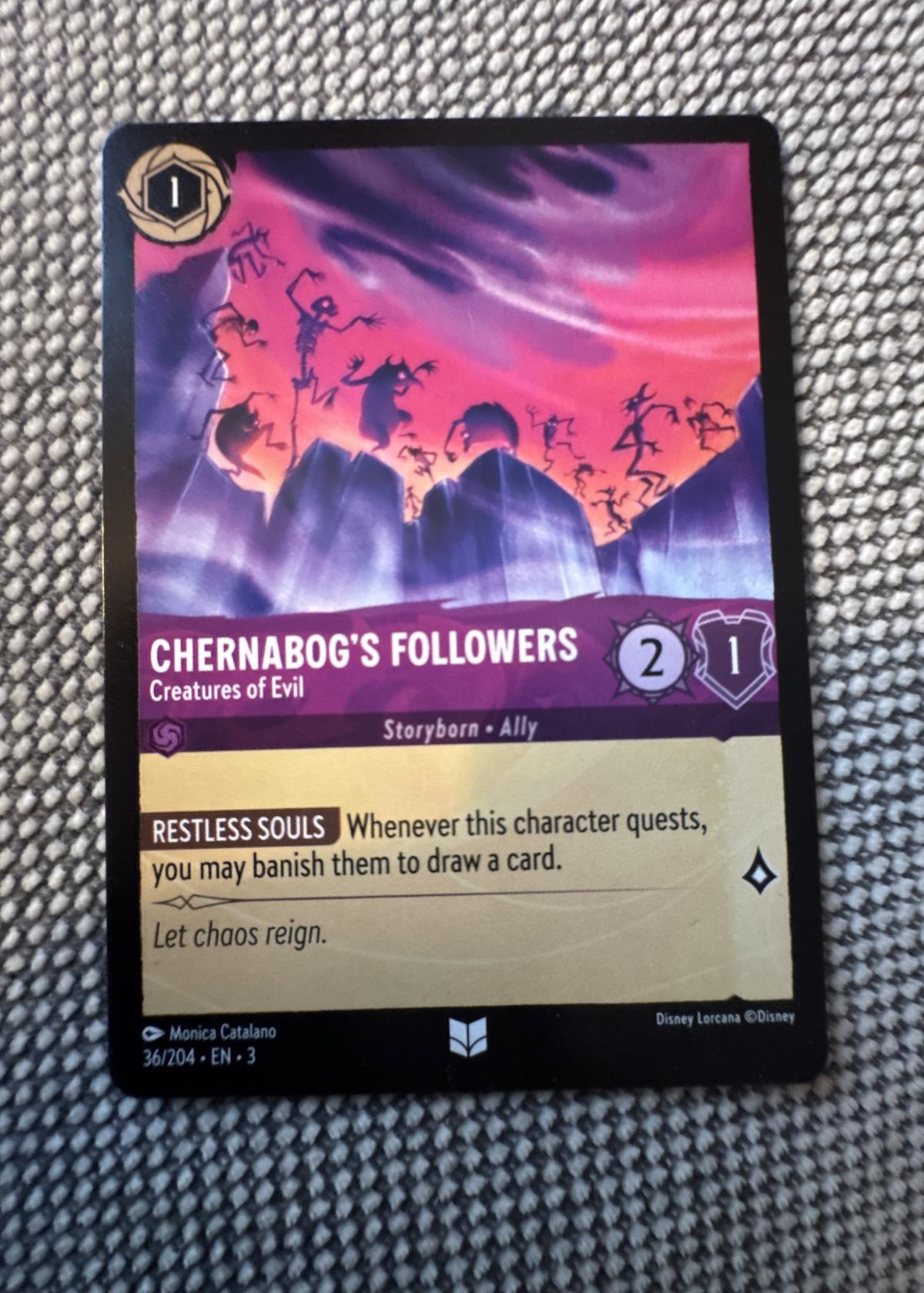 This is a Chernabog's Followers trading card from the Disney Lorcana card game. It's a Storyborn Ally card with the 'Restless Souls' ability, allowing you to banish this character after questing to draw a card. Card number 36/204, featuring artwork by Monica Catalano. Ideal for collectors or players looking to enhance their Lorcana deck.
