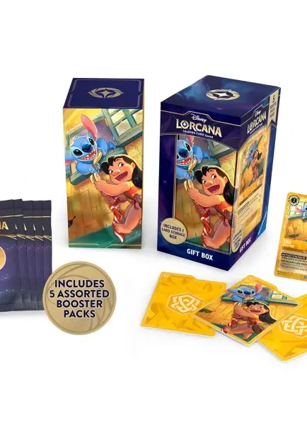 This Disney Lorcana Gift Box includes a unique foil card featuring brand-new Lilo art and comes with an assortment of Booster Packs containing 60 cards from different Disney Lorcana TCG sets.