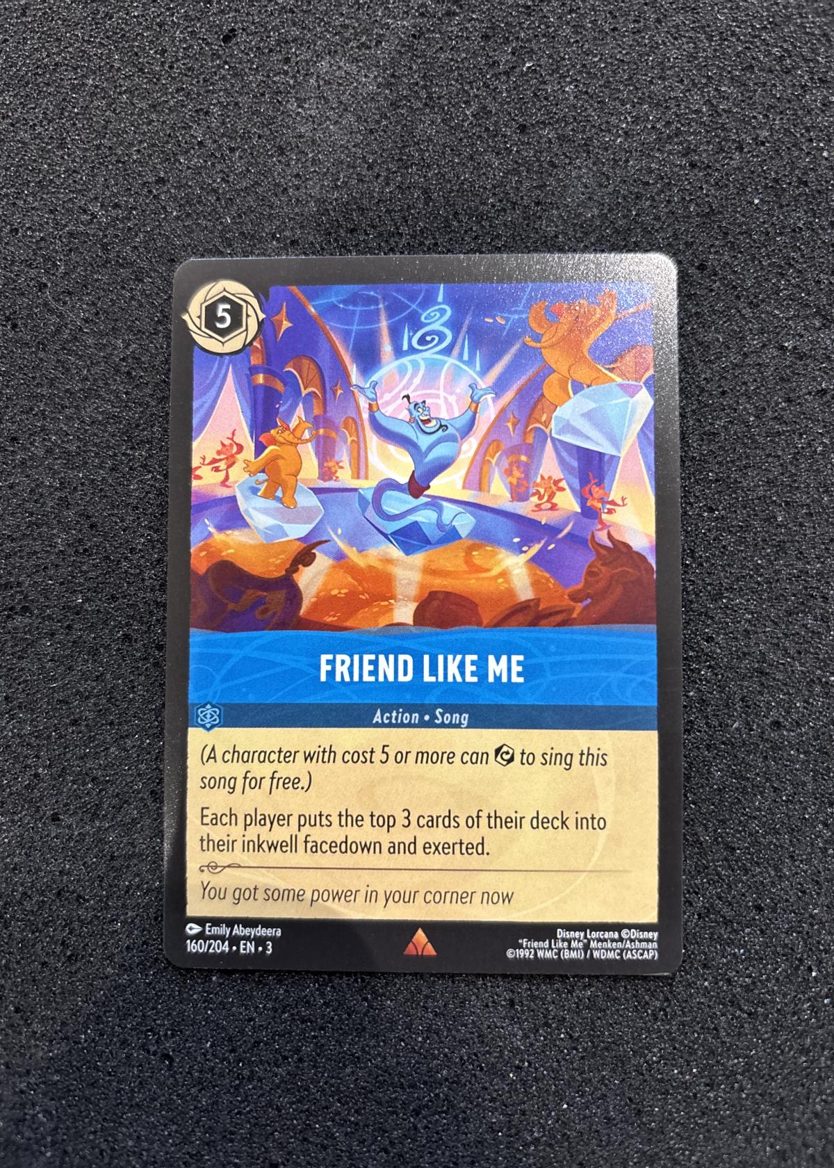 This is a Disney Lorcana trading card titled 'Friend Like Me'. It is an Action - Song card illustrated by Emily Abeydeera, featuring Genie in a vibrant and magical scene. The card allows a character with a cost of 5 or more to sing the song for free, and each player puts the top 3 cards from their deck into their inkwell facedown and exerted. Card number 160/204 from the set.