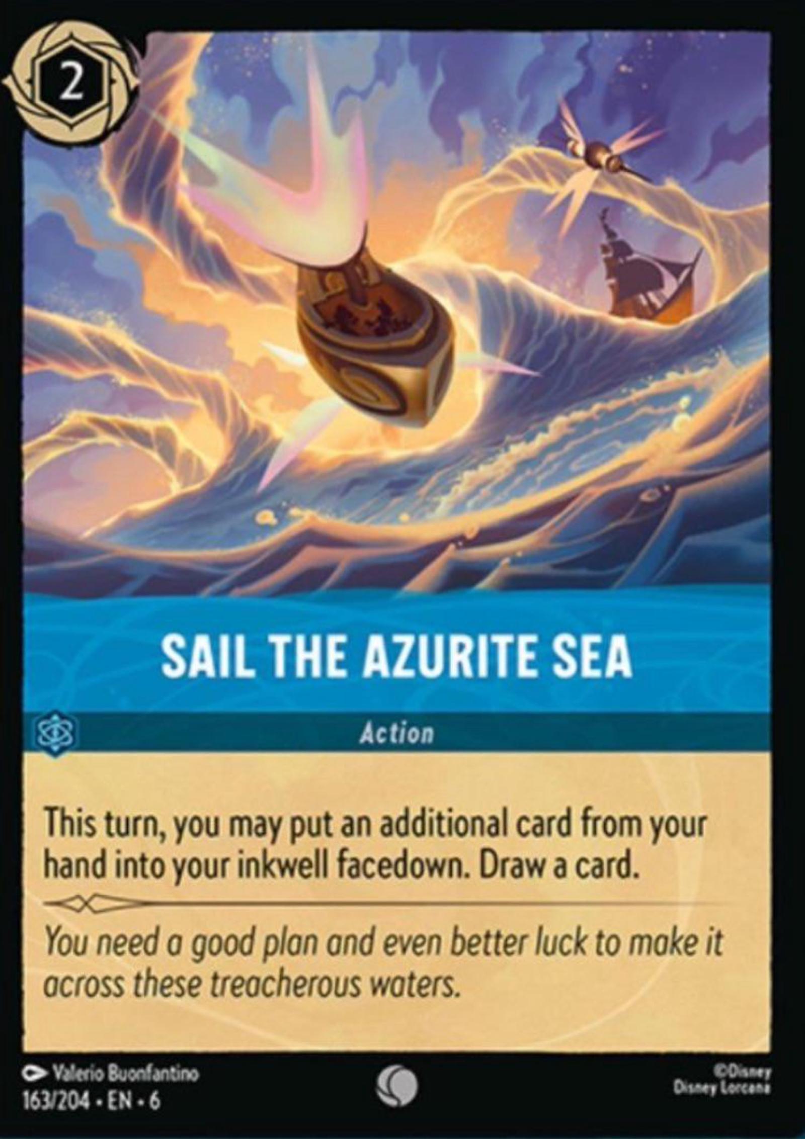 Card details & artwork: Sail the Azurite Sea is an Action card (card #163/204) printed in English. Artwork by Valerio Buonfantino is featured on the face, with vibrant seascape colors and clear text. This listing is for the regular (non-foil) version as shown in the photos.