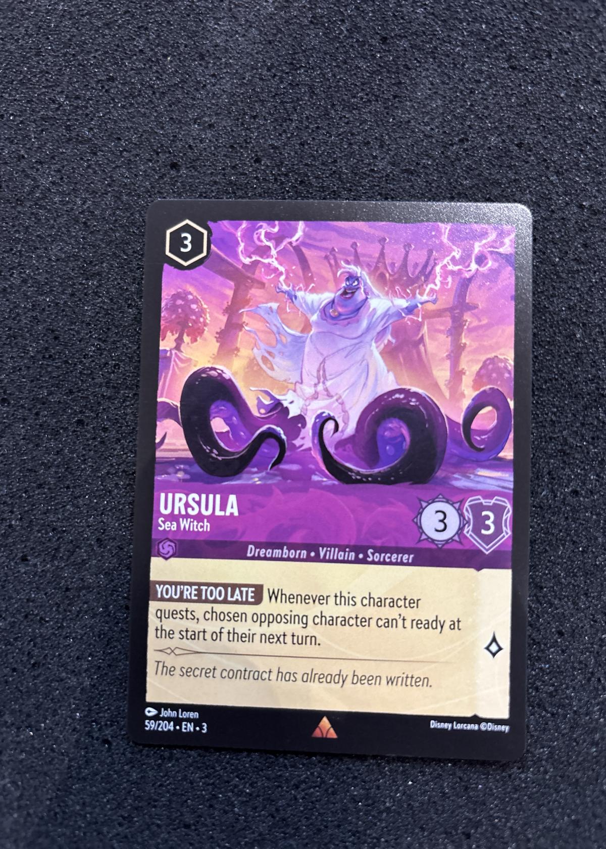 This is an Ursula Sea Witch card from the Disney Lorcana trading card game. The card features unique art by John Loren and includes the abilities 'Dreamborn,' 'Villain,' 'Sorcerer,' and the effect 'You're Too Late.' It is card number 59 out of 204 from the set (EN - 3). A must-have for collectors and players of Lorcana.