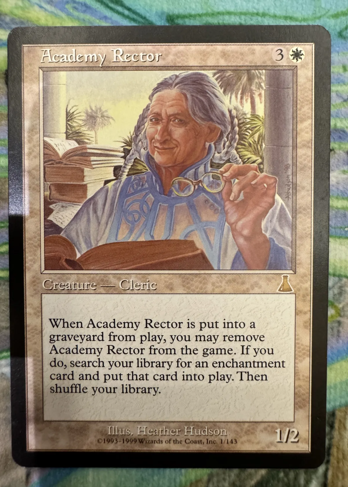 Academy Rector is a classic Magic: The Gathering card illustrated by Heather Hudson, from the set 'Urza's Destiny.' This is an English, non-foil printing. Academy Rector is highly sought after for both its playability in Commander and its collectibility as a Reserved List card. Its ability to cheat powerful enchantments directly into play makes it a strong card in many white-based decks. Card number 1/143.