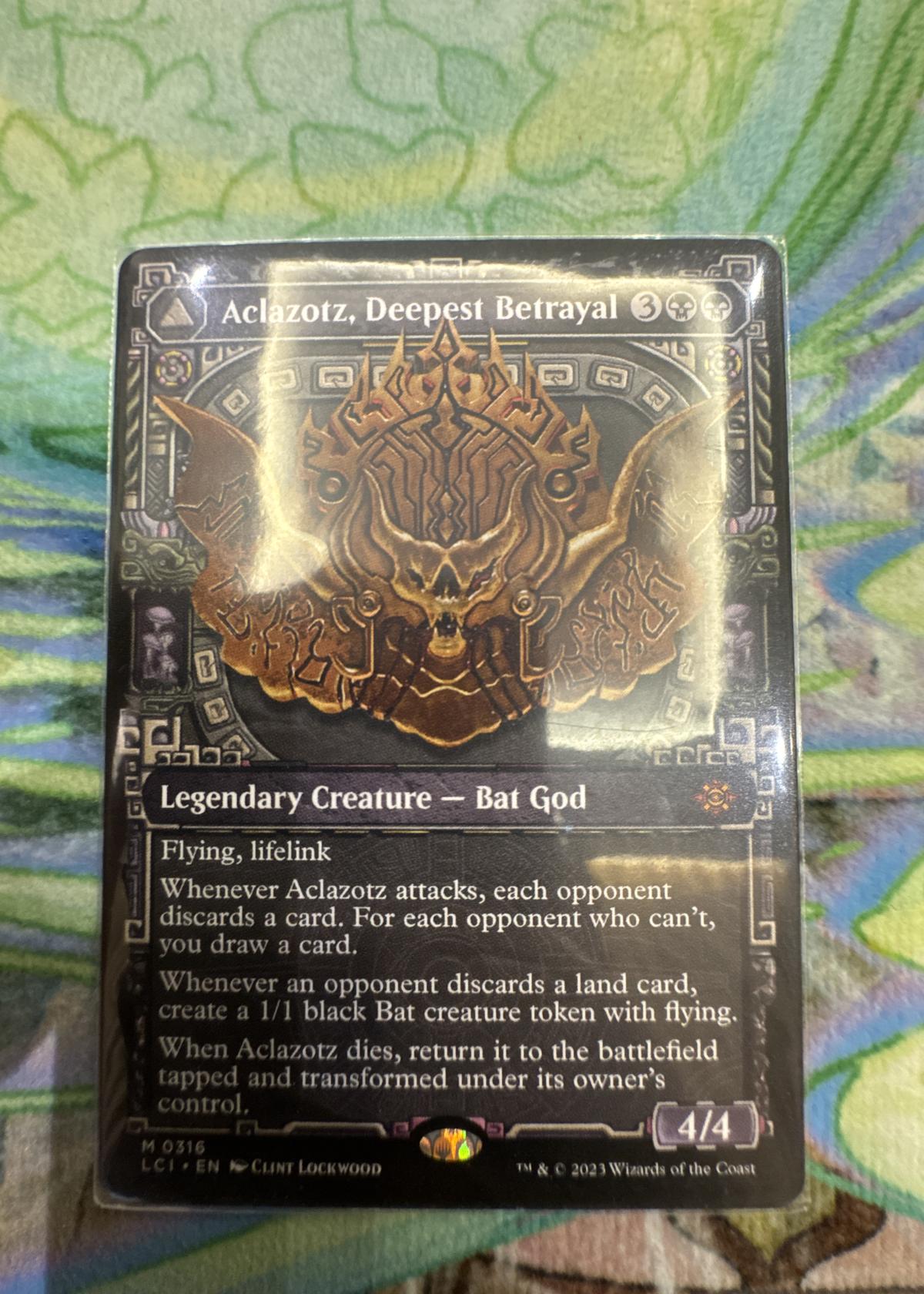 Aclazotz, Deepest Betrayal is a legendary creature card (Bat God) from the Magic: The Gathering set The Lost Caverns of Ixalan (LCI). Illustrated by Clint Lockwood, this card features flying and lifelink. Whenever Aclazotz attacks, each opponent discards a card, and if they can't, you draw a card. It also generates 1/1 black Bat creature tokens whenever an opponent discards a land card, and returns to the battlefield transformed under its owner's control when it dies. This card is in English and has a normal (non-foil) printing. As of its release, it is both collectible and playable in Commander and other formats, often valued for its unique discard and recursion abilities.