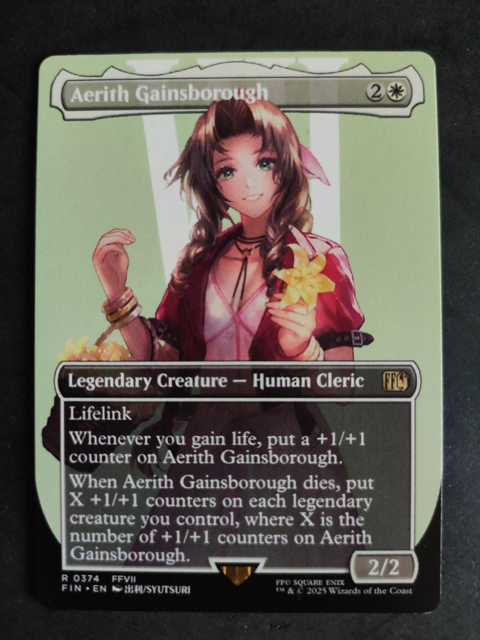 Aerith Gainsborough from the Final Fantasy crossover set by Wizards of the Coast. This card is a Legendary Creature - Human Cleric with lifelink and counters mechanics. Set FFVII, card number 374. Illustrated by SYUTSURI. The card is a Japanese promo and is non-foil. Playable in life-gain themed decks, good for collectible purposes due to the unique collaboration.